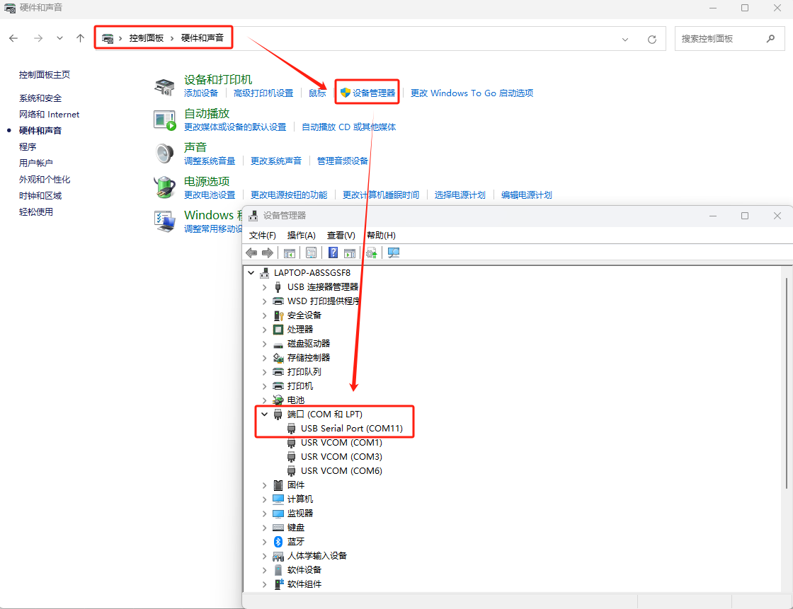打開電腦控制面板---硬件和聲音---設(shè)備管理器---COM和LPT,確認(rèn)下USB轉(zhuǎn)換器的COM口,圖示COM11。
