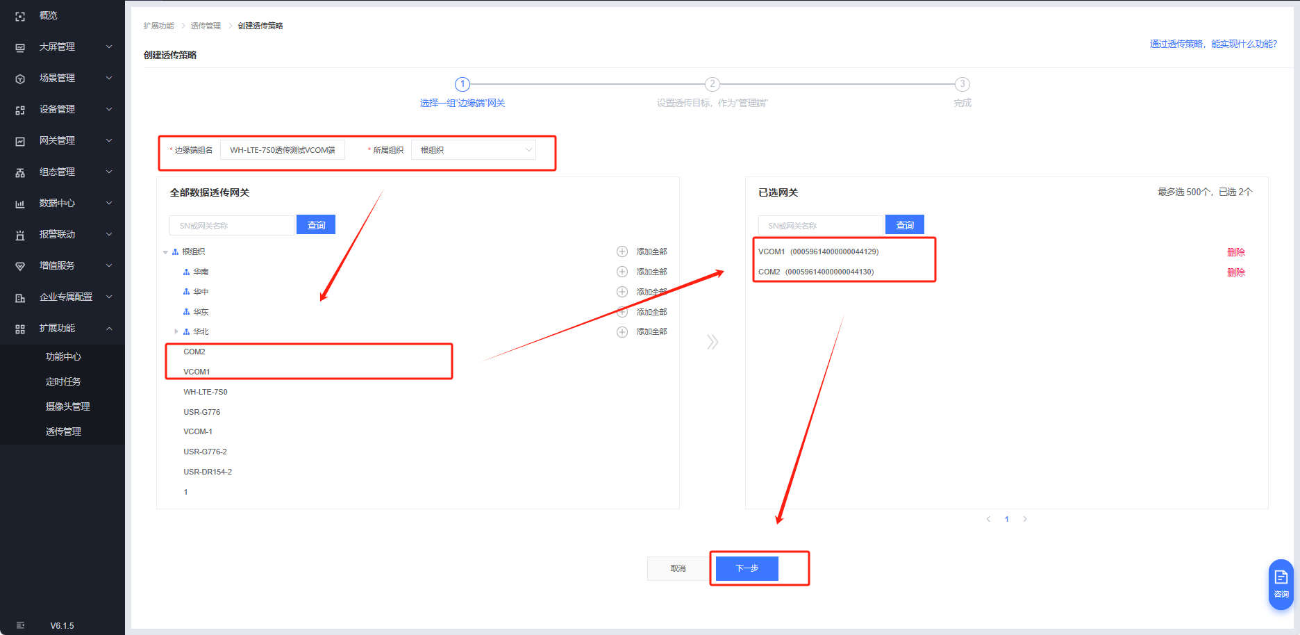 邊緣端命名WH-LTE-7S0透傳測試VCOM端,選擇根組織,選中兩個VCOM,下一步