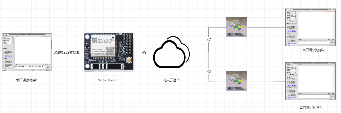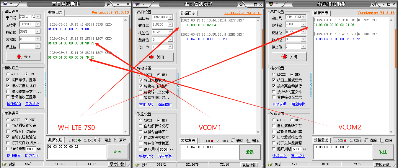 打開三個串口調(diào)試助手軟件,分別引用兩個虛擬和串口和WH-LTE-7S0的串口,發(fā)送數(shù)據(jù)進行一對多透傳測試