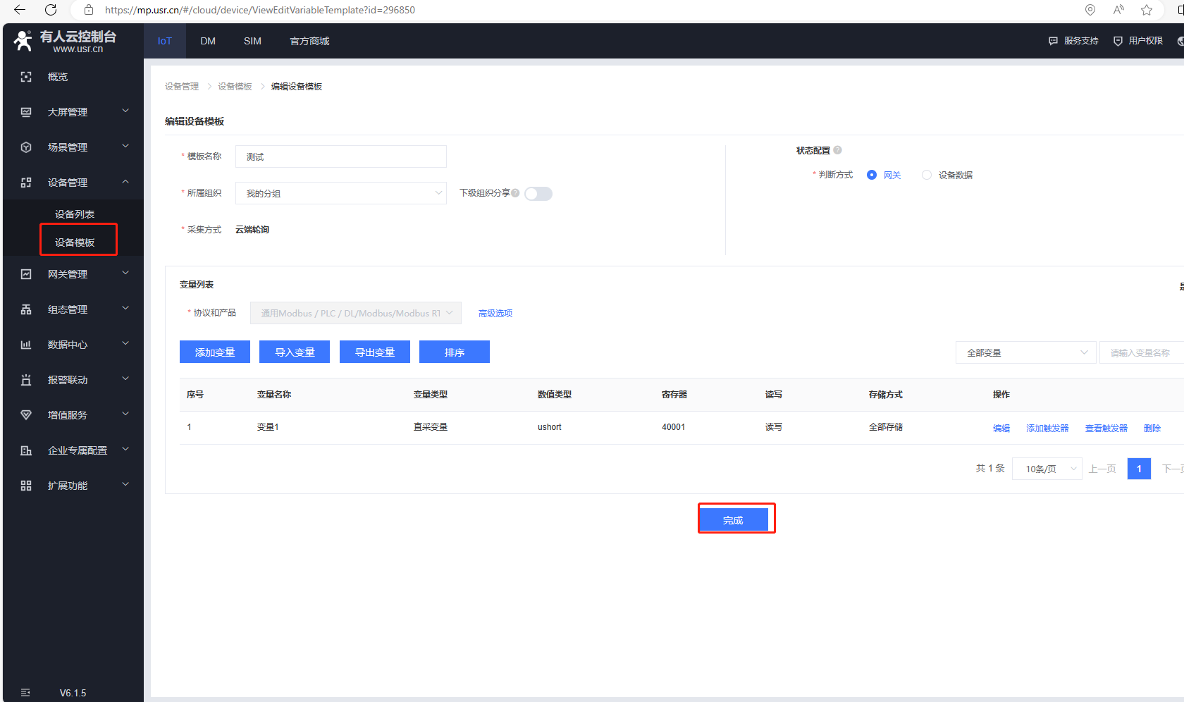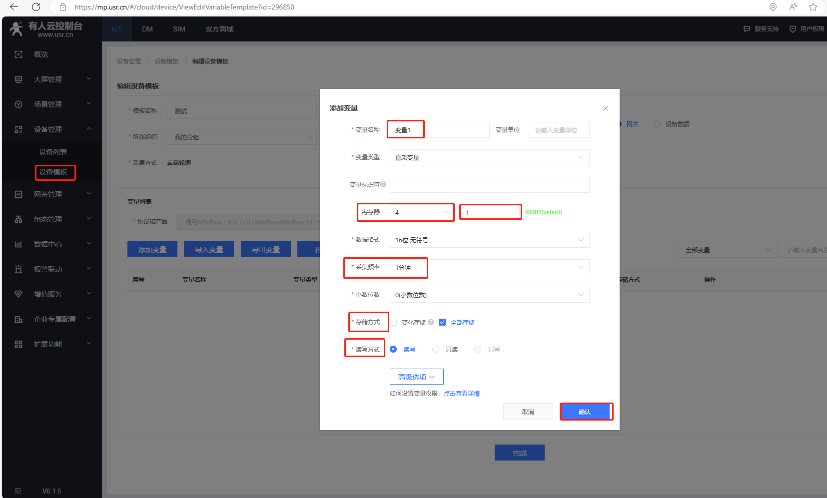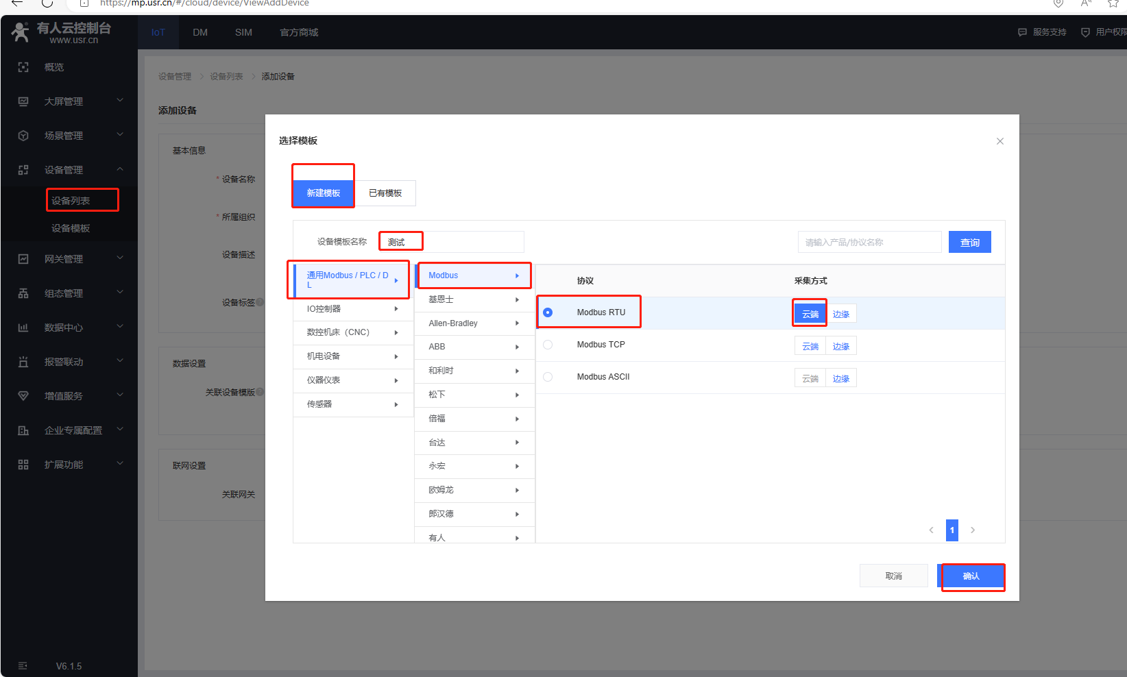 選擇新建模板,輸入設備模板名稱,通用Modbus/PLC/DL,選擇Modbus,協議選擇Modbus Rtu,采集方式云端,最后確認。