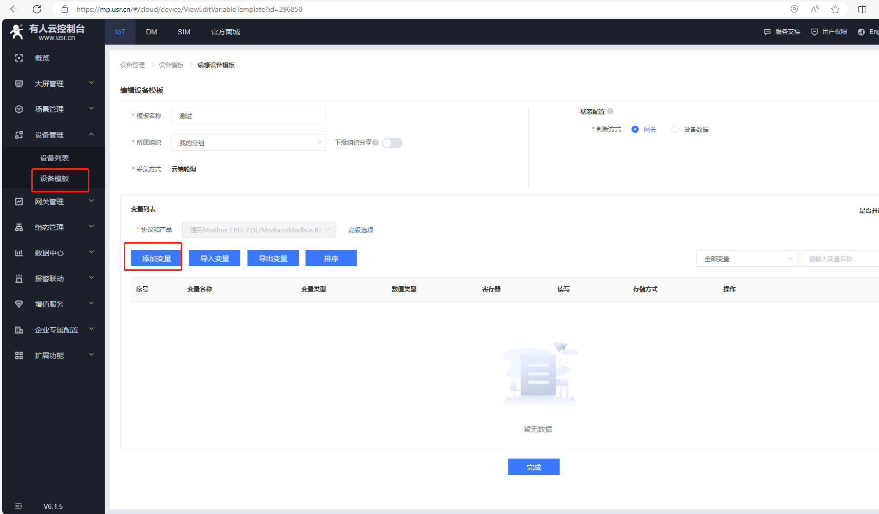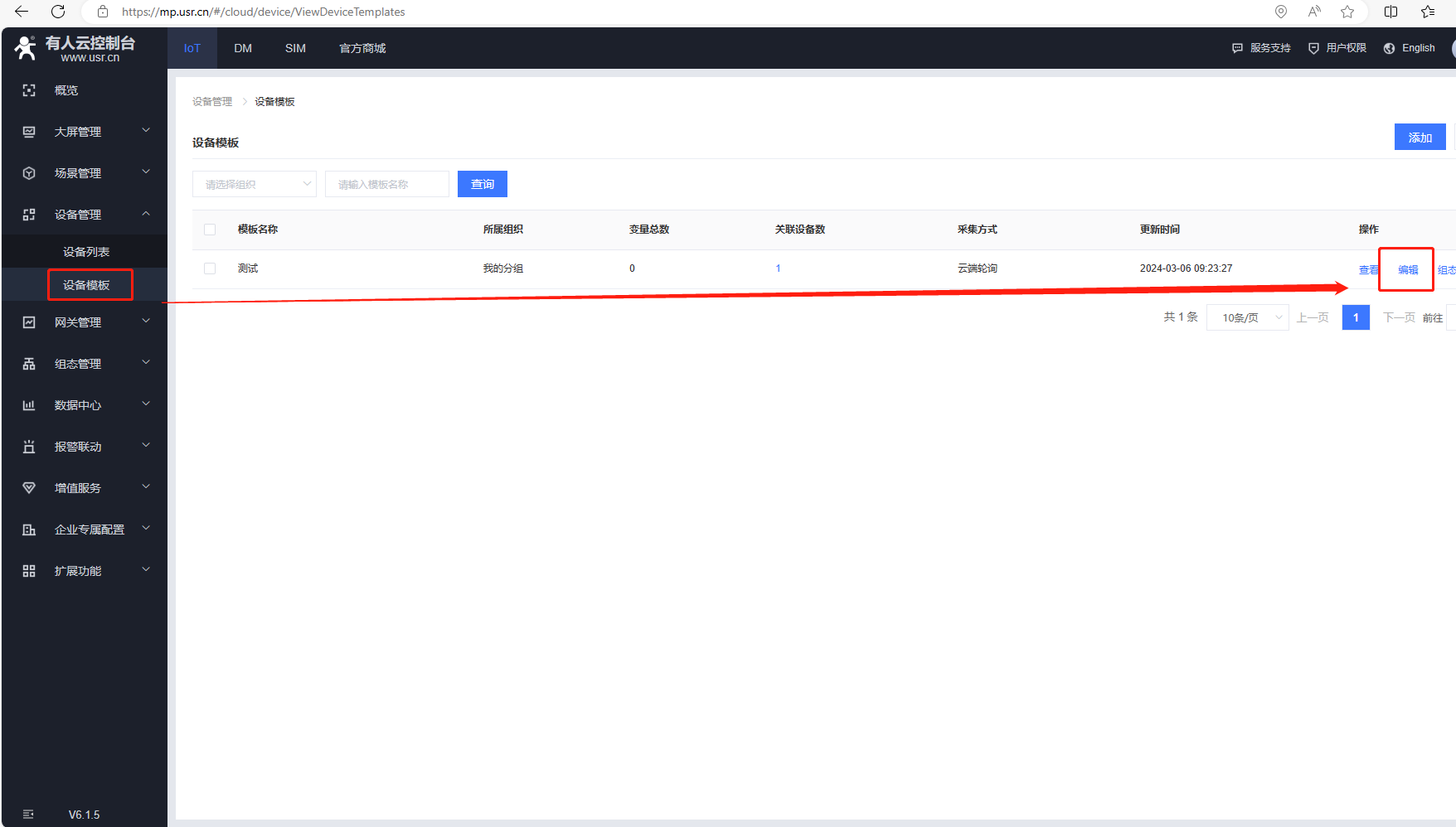 6、添加變量,點擊設備管理,點擊設備模板,點擊編輯。