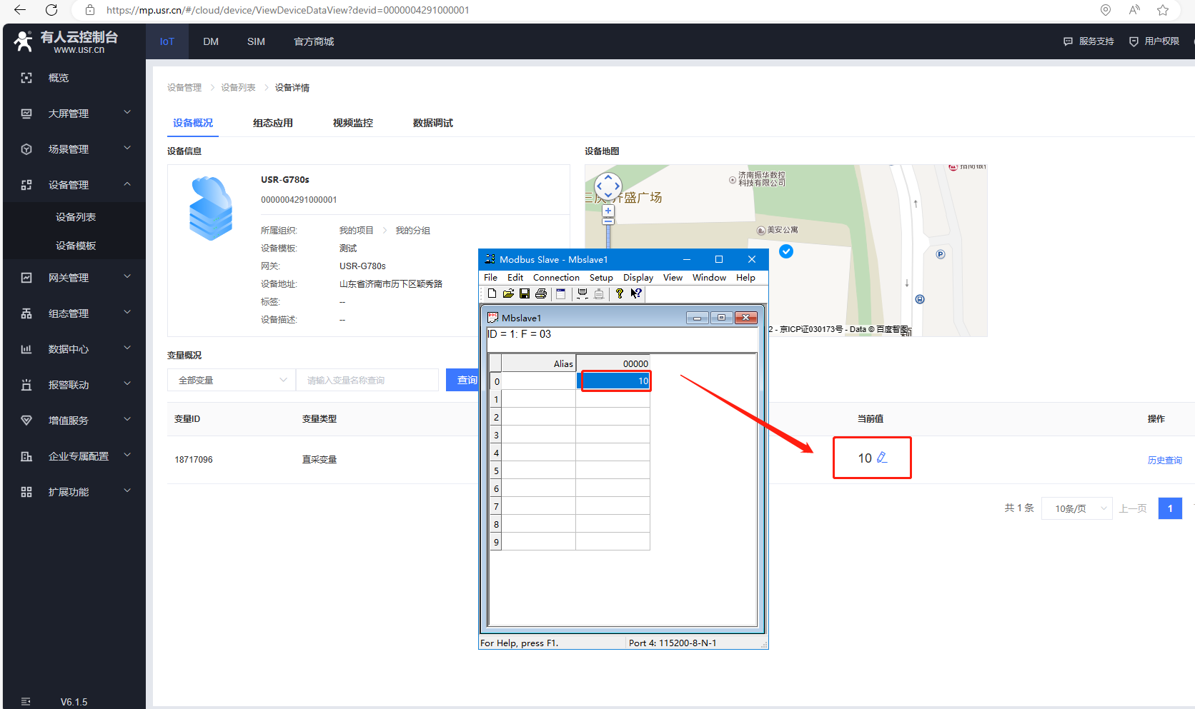 4、MODBUS slave數據設置10,有人云設備列表1分鐘采集,可以看到變量采集的當前值數據10。