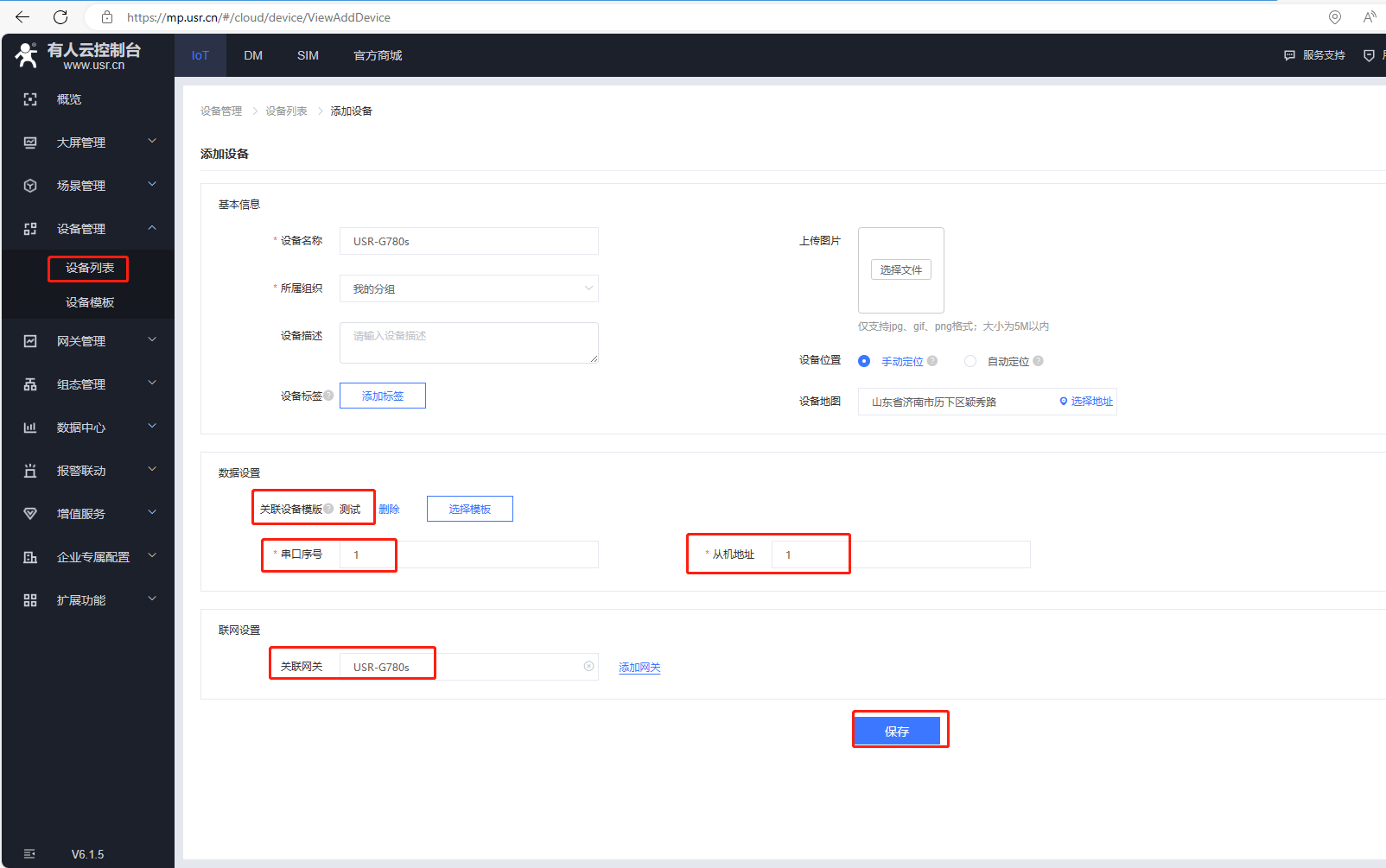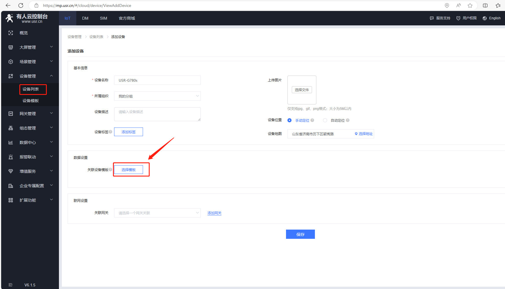 聯網設置,關聯網關選擇自身設備,USR-G780s,最后點擊保存。
