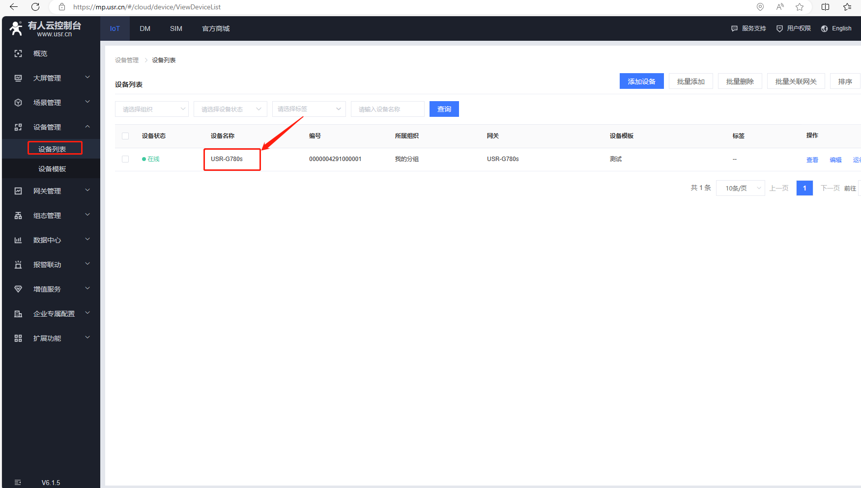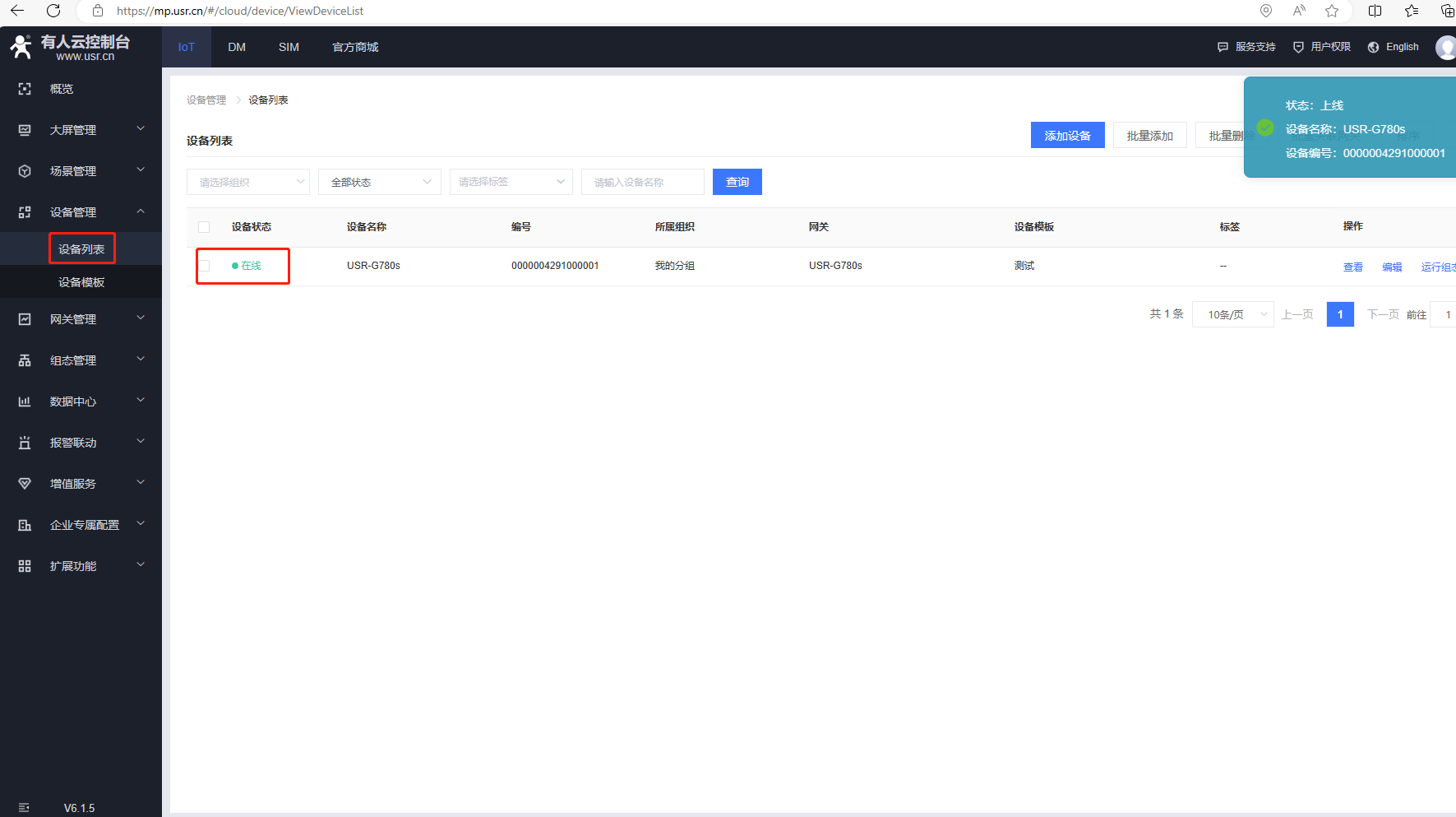 (3)添加完成,返回網關列表,USR-G780s支持我們內置SIM卡,聯網正常后,網絡狀態在線。也可以單獨插外置卡(可以上網的物聯卡、手機卡)
