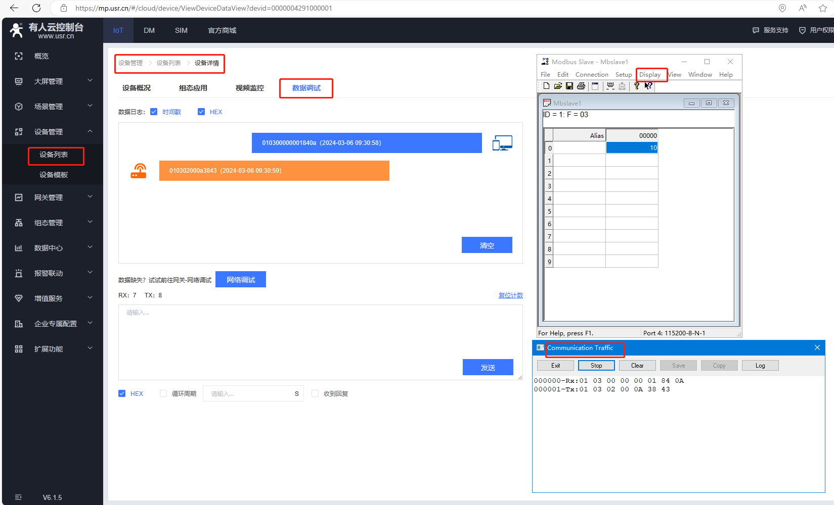 還可以利用有人云的數據調試功能,查看有人云的數據收發是否正常。