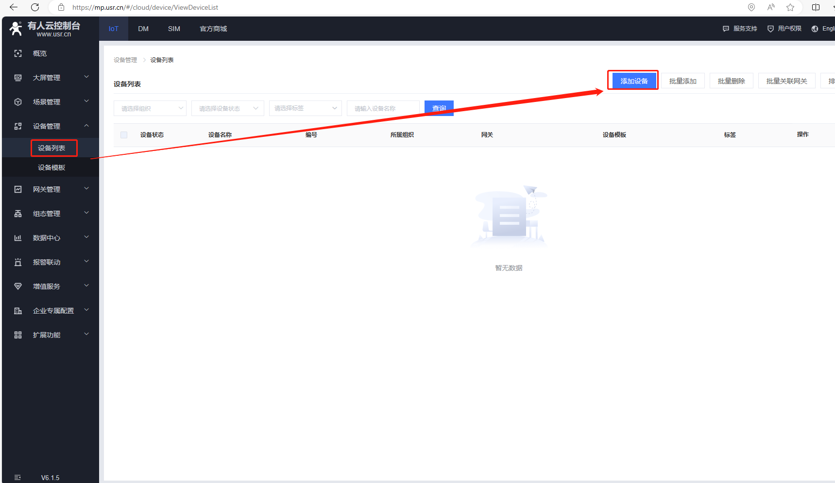 3、添加設備,點擊設備管理,點擊設備列表,點擊添加設備。