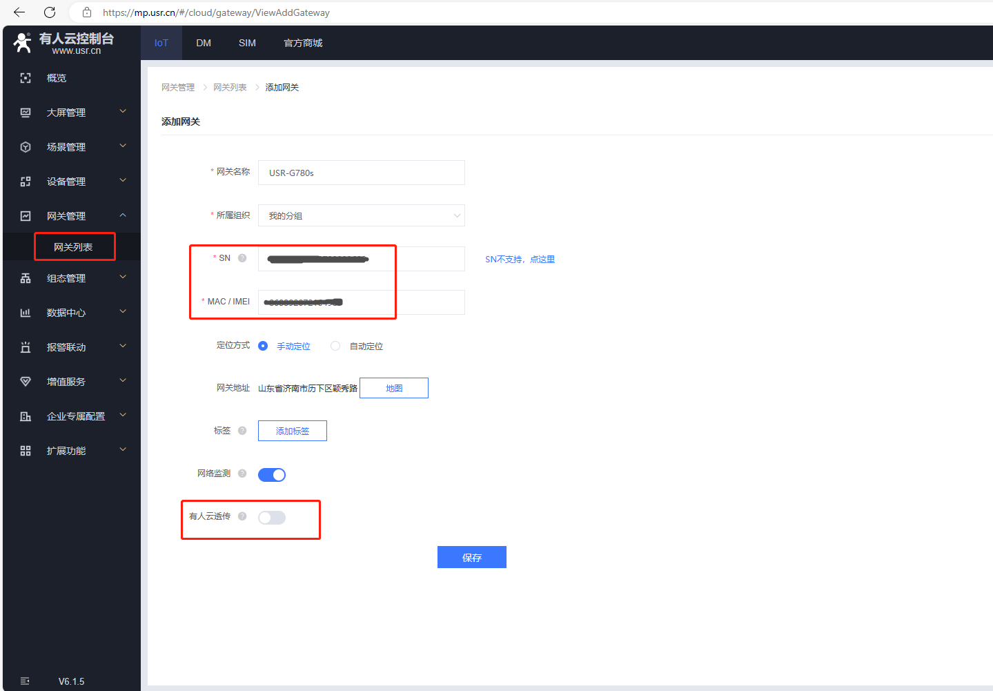 (2)USR-G780s查看產品反面標簽,使用SN和IMEI在有人云上添加設備,用云端輪詢時有人云透傳需要關閉,最后點擊保存。