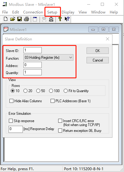 2、點擊Setup,Slave ID從機地址用1,Function功能碼用03,Address寄存器起始地址用0,Quantity寄存器地址數量用1。