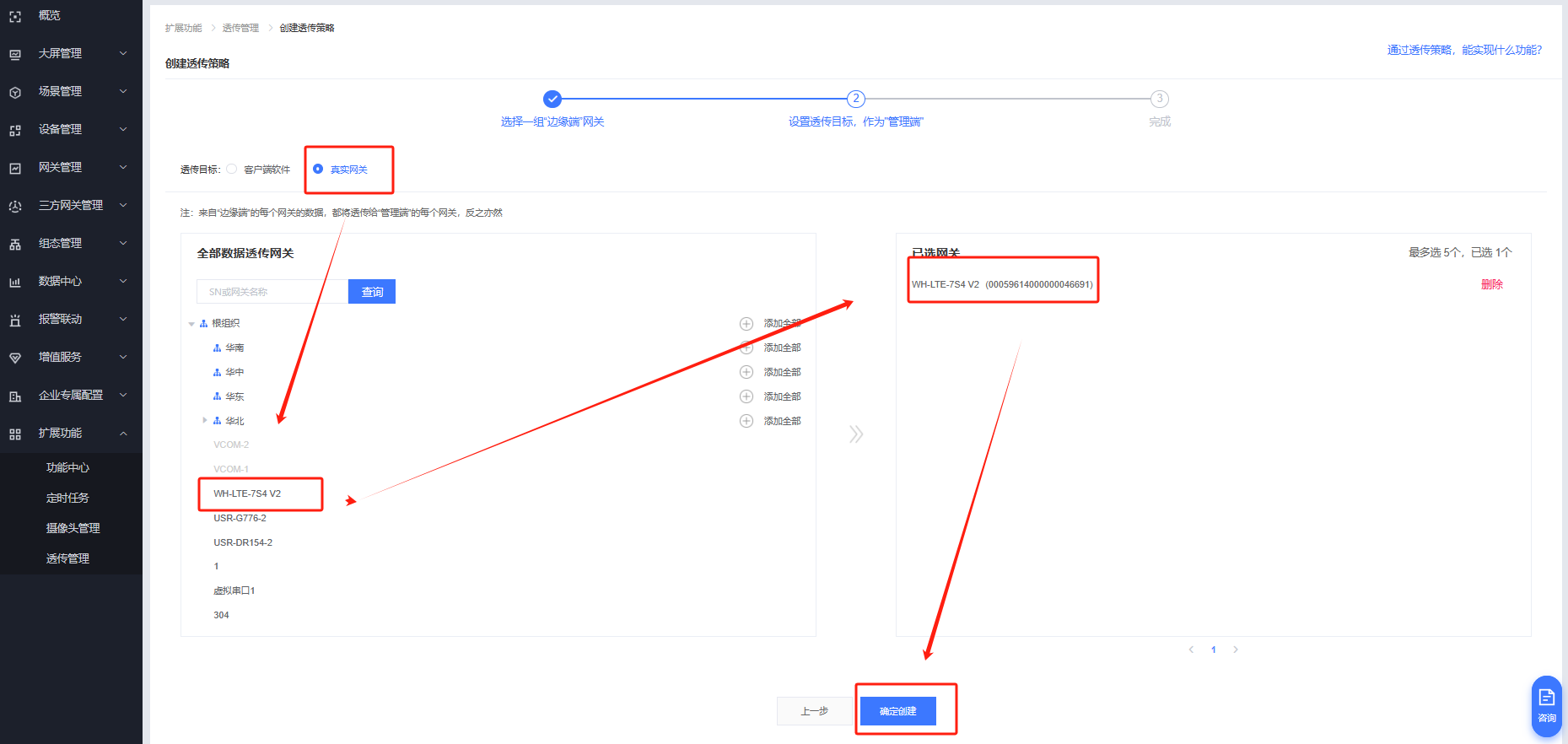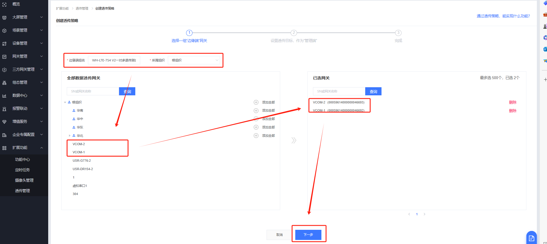 命名WH-LTE-7S4 V2一對多透傳測試,所屬組織根組織,選擇VCOM-1和VCOM-2,下一步。