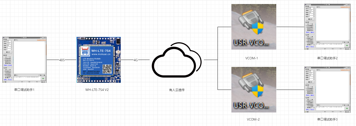 WH-LTE-7S4 V2插入SIM卡,然后模組插入到底板USR-7X-EVK上, EVK的485串口接USB-RS485串口線到電腦USB口,然后EVK接12V電源適配器上電。