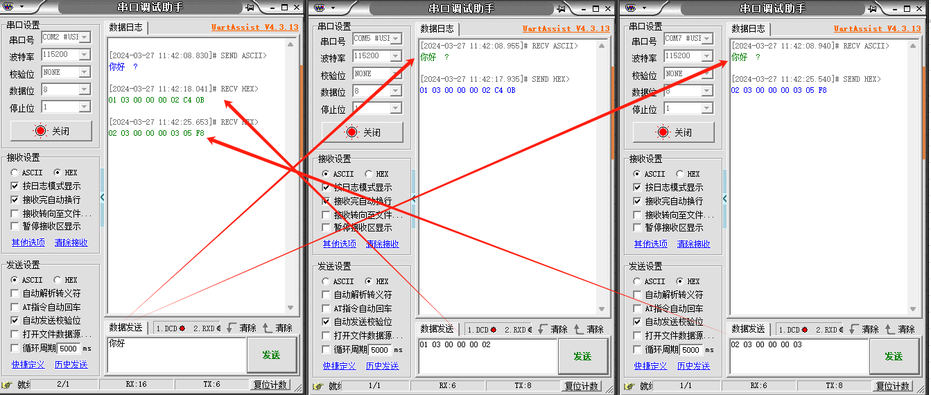 打開三個串口調試助手,分別引用兩個虛擬串口和轉換器的COM口,進行數據交互測試。