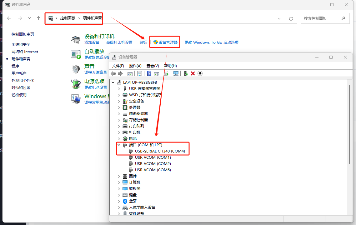 打開控制面板---硬件和聲音---設備管理器---COM和LPT,確認轉換器COM口