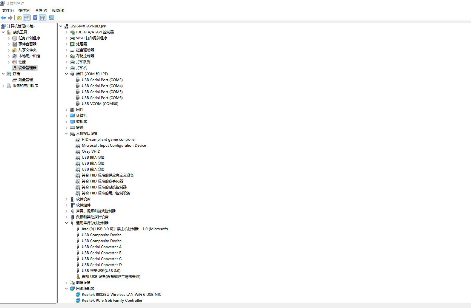 電腦鼠標點擊計算機管理,右擊,點開設備管理器,點擊端口,查看接USR-G780s的USB-RS232串口線COM口號,COM4。