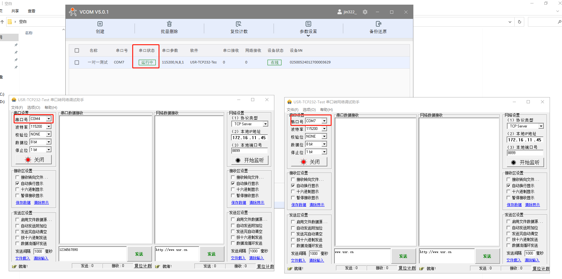 1、打開2個串口助手,分別用USR-G780s實際USB串口COM4打開串口,另一個串口助手用虛擬串口COM7打開串口。