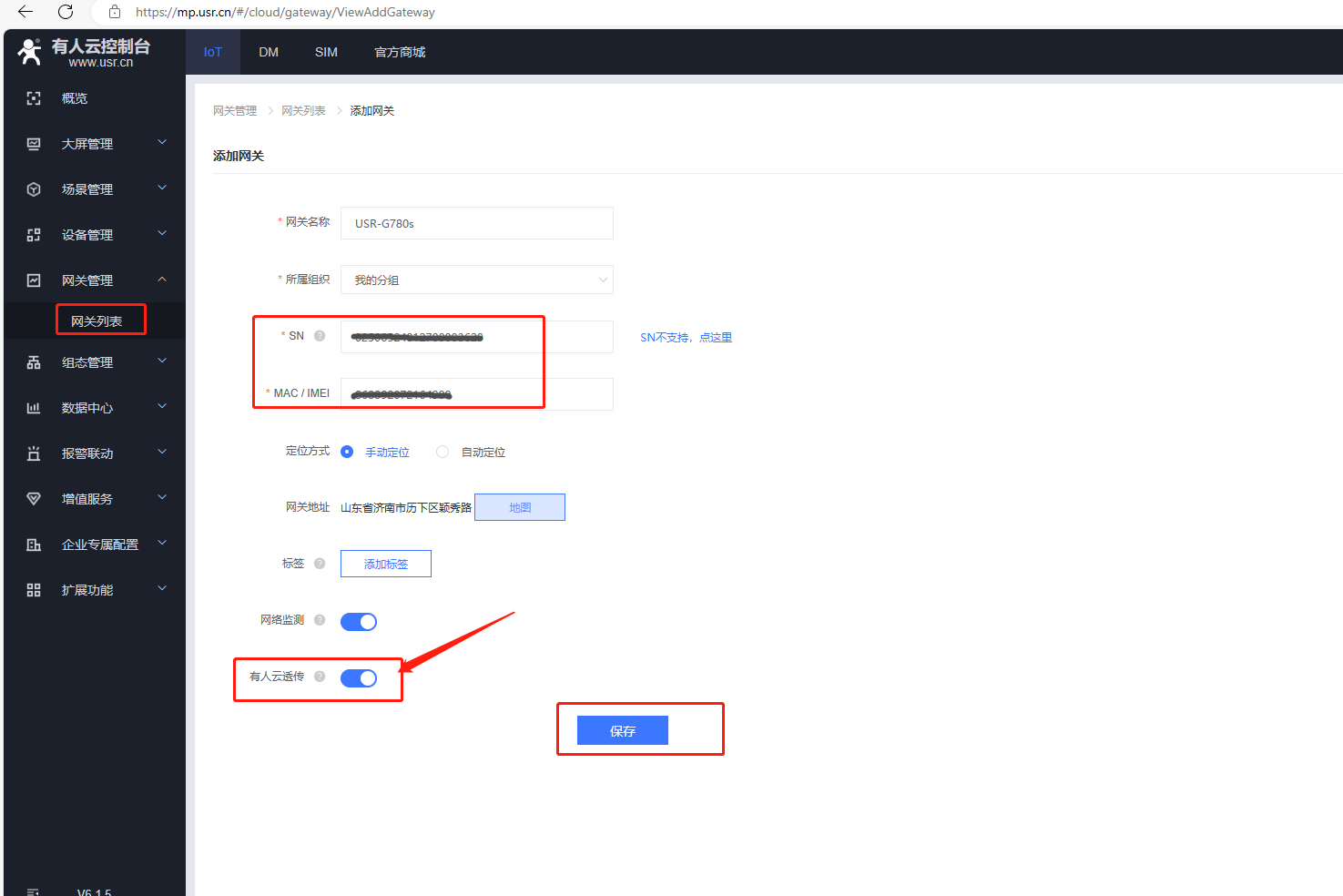 (2)USR-G780s查看產品反面標簽,使用SN和IMEI在有人云上添加設備,和虛擬串口一對一通訊,有人云透傳需要勾選開啟,最后點擊保存。