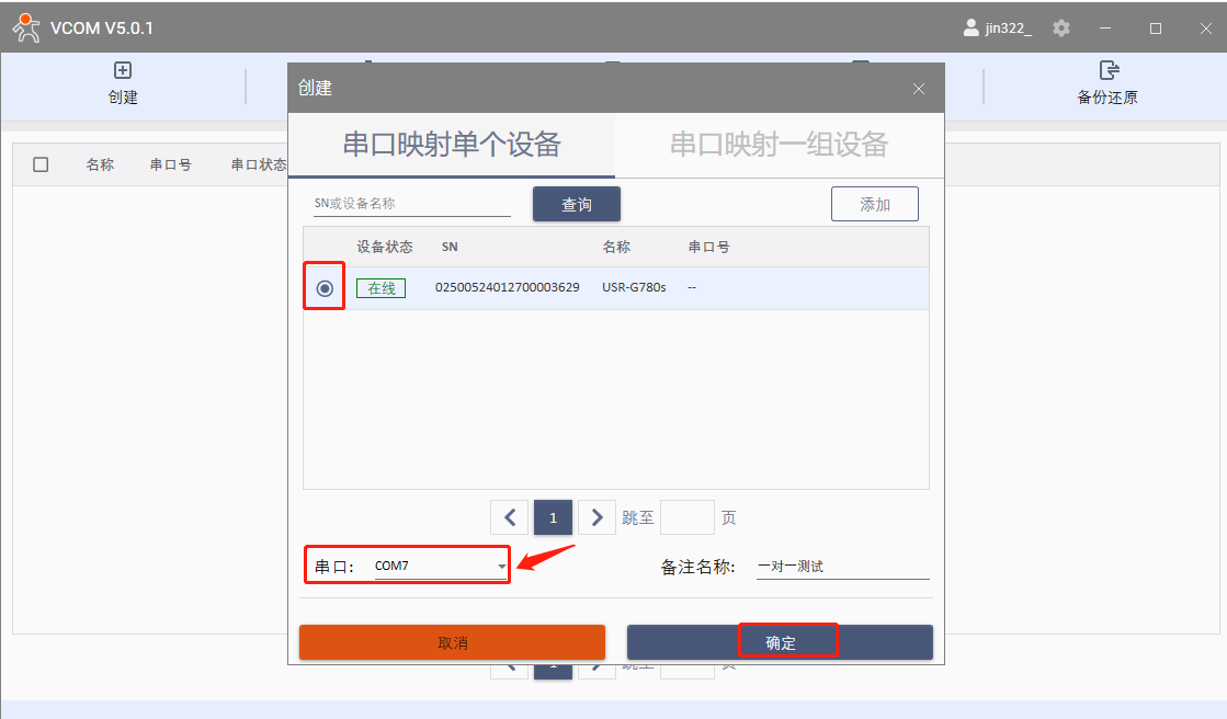 選擇串口映射單個設備,勾選在線的USR-G780s,用空閑的COM7作為虛擬串口的COM口號,點擊確定。