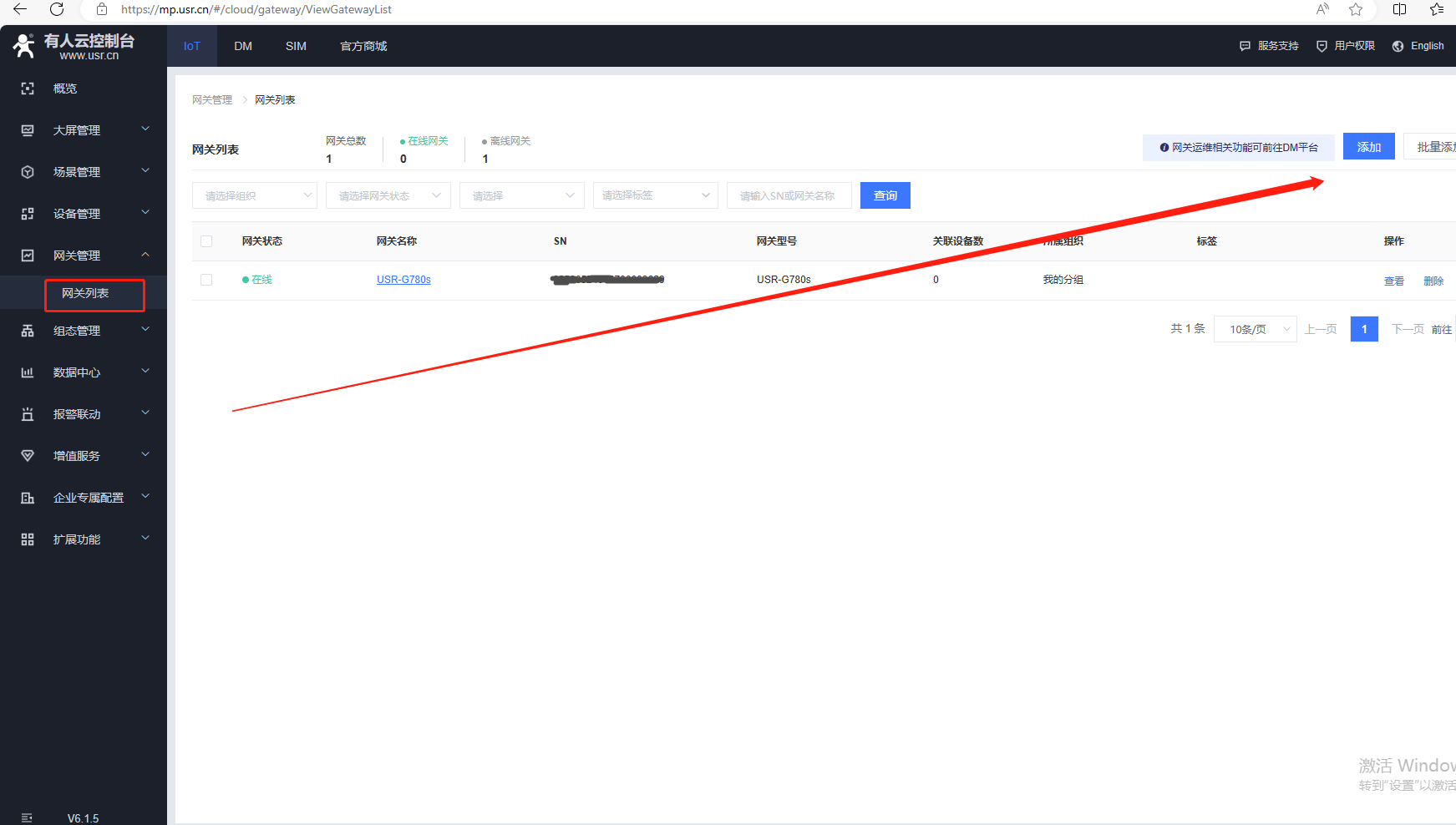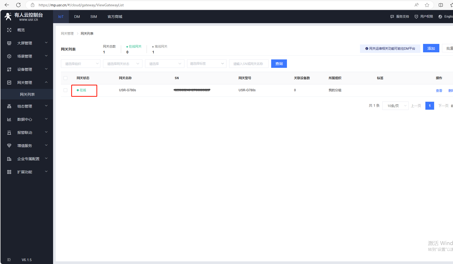 (3)添加完成,返回網(wǎng)關(guān)列表,USR-G780 V2插物聯(lián)卡,聯(lián)網(wǎng)正常后,網(wǎng)絡(luò)狀態(tài)在線。