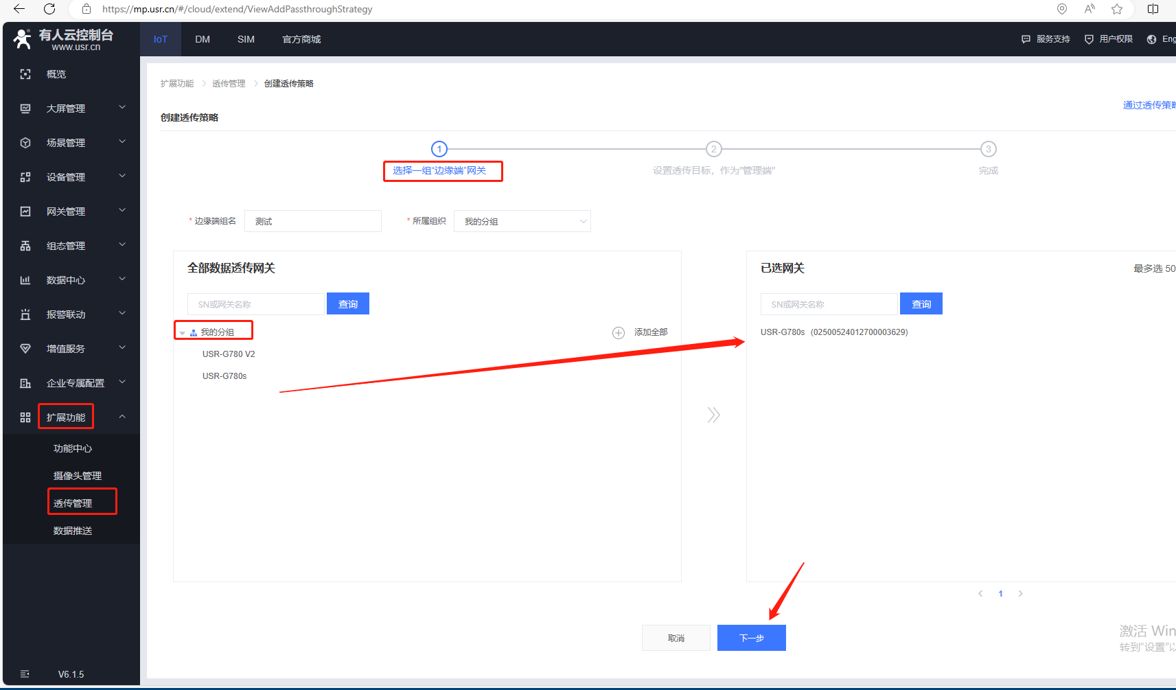 3、選擇一組“邊緣端”網(wǎng)關(guān),從我的分組選擇USR-G780s作為邊緣端,點(diǎn)擊下一步