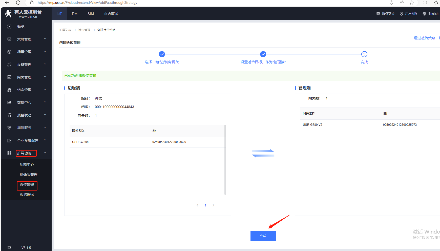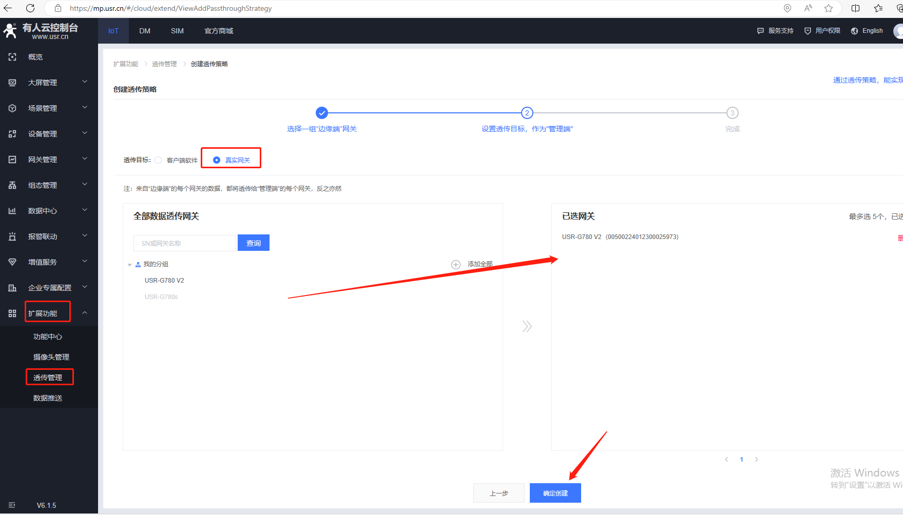 4、設(shè)置透?jìng)髂繕?biāo),作為“管理端”,透?jìng)髂繕?biāo)這里選擇真實(shí)網(wǎng)關(guān),在我的分組中,選擇USR-G780 V2作為管理端,點(diǎn)擊確定創(chuàng)建。