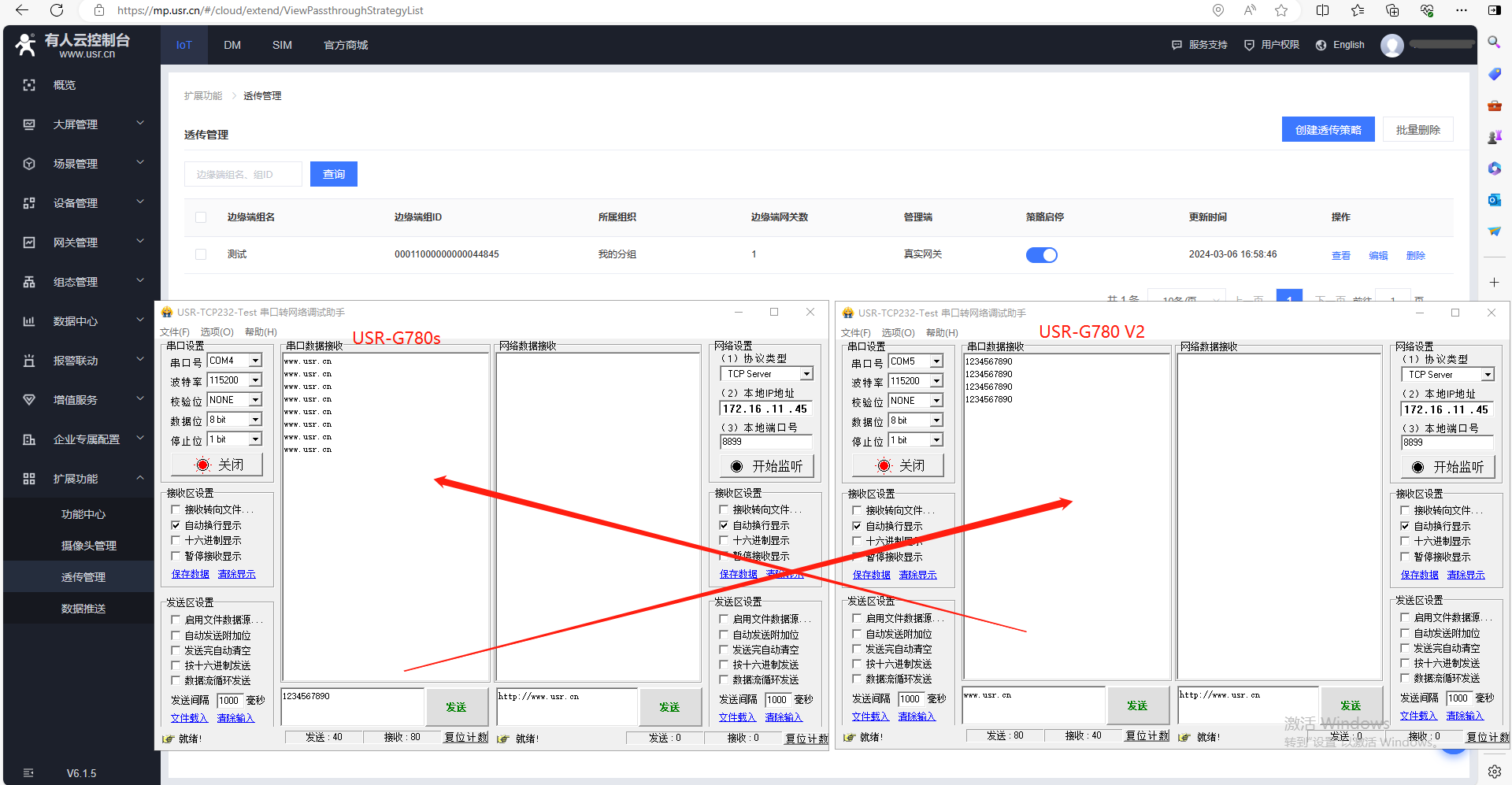 打開2個(gè)串口助手,分別用USR-G780s實(shí)際USB串口COM4打開串口,USR-G780 V2實(shí)際USB串口COM5打開串口。可以實(shí)現(xiàn)2個(gè)串口相互發(fā)送數(shù)據(jù),實(shí)現(xiàn)USR-G780s和USR-G780 V2之間串口數(shù)據(jù)透?jìng)鳌?/span>