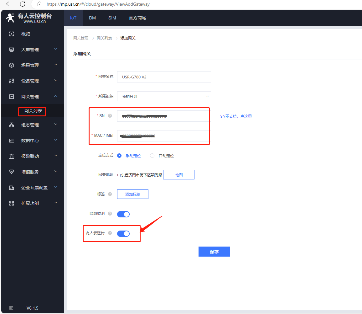 (2)USR-G780 V2查看產(chǎn)品反面標(biāo)簽,使用SN和IMEI在有人云上添加設(shè)備,和虛擬串口一對(duì)一通訊,有人云透?jìng)餍枰催x開啟,最后點(diǎn)擊保存。