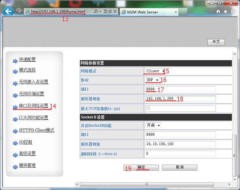 b)服務(wù)器地址修改為192.168.1.255,是因?yàn)槟K連接到的路由器網(wǎng)段為192.168.1.1,255為廣播地址。假設(shè)模塊連接到的路由器網(wǎng)段為192.168.2.1,模塊服務(wù)器地址則需要設(shè)置為192.168.2.255。