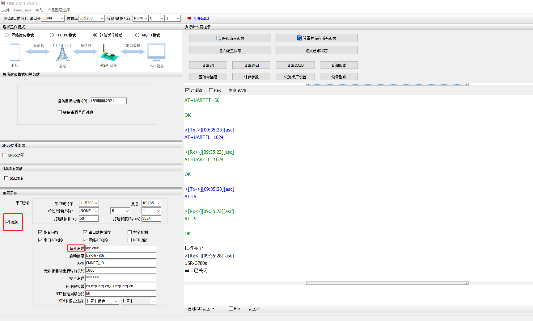 命令密碼默認是usr.cn#,USR-G780s用設置軟件讀取參數,勾選高級,可以從高級內容中,查詢或修改命令密碼。
