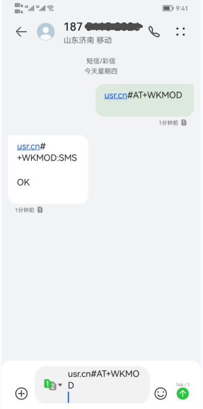 以查工作模式為例,發送 AT 指令,從手機端向模塊發送usr.cn#AT+WKMOD(注意該字符串最后有一個回車符),模塊接收后, 會返回響應信息如下圖: