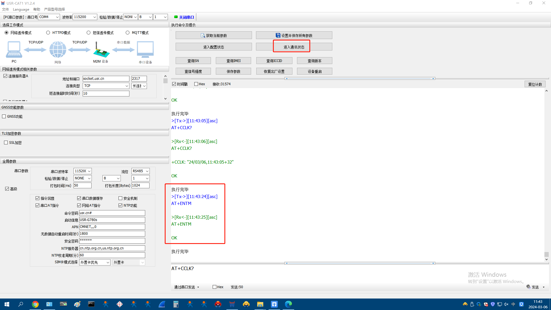 打開串口,點擊進入配置狀態(tài),設(shè)置軟件右下角發(fā)送后面小三角點擊,選擇AT指令自動加回車,然后再輸入框輸入AT+CCLK,點擊發(fā)送,可以獲取當前時間。