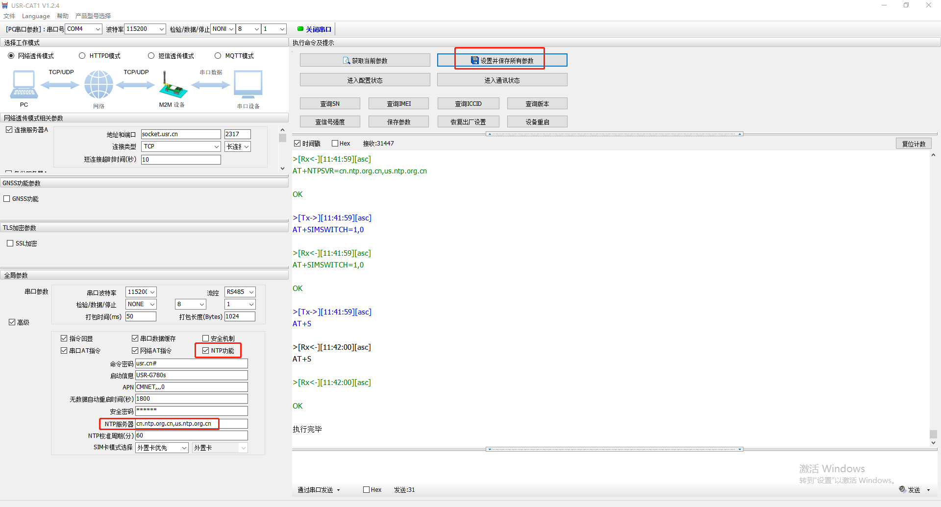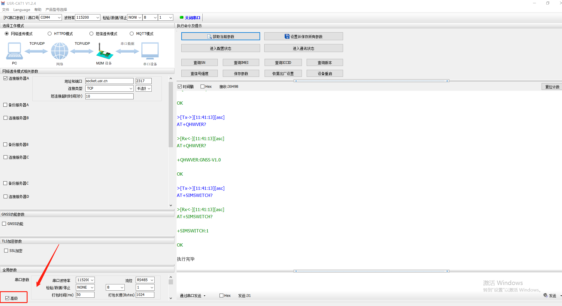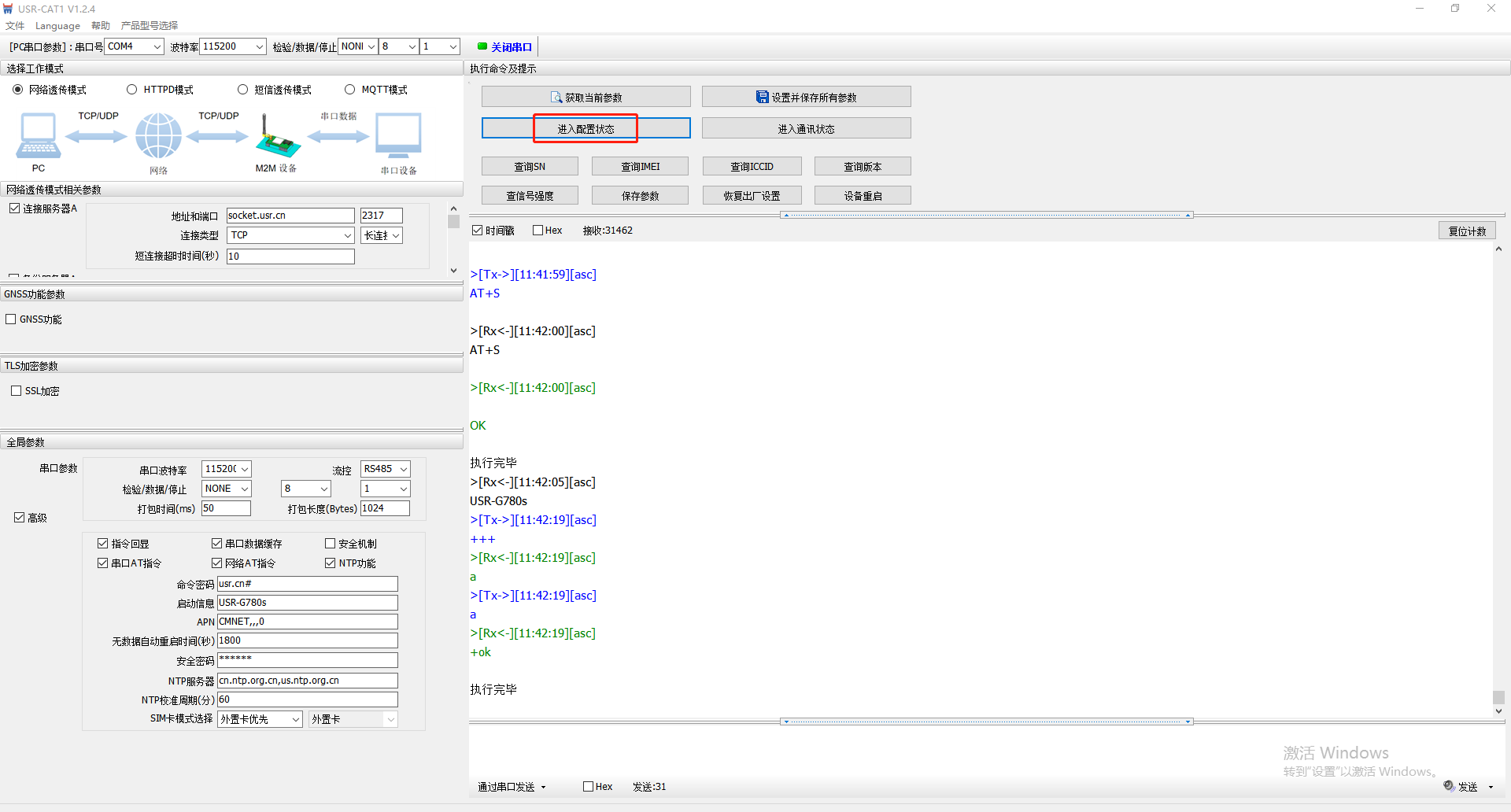 USR-G780s 的232串口接USB-RS232串口線到電腦USB口,接好4G天線,然后產(chǎn)品接12V電源適配器上電。