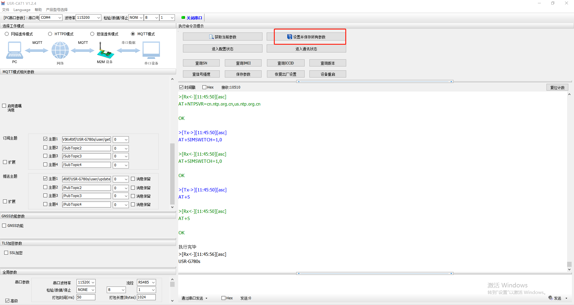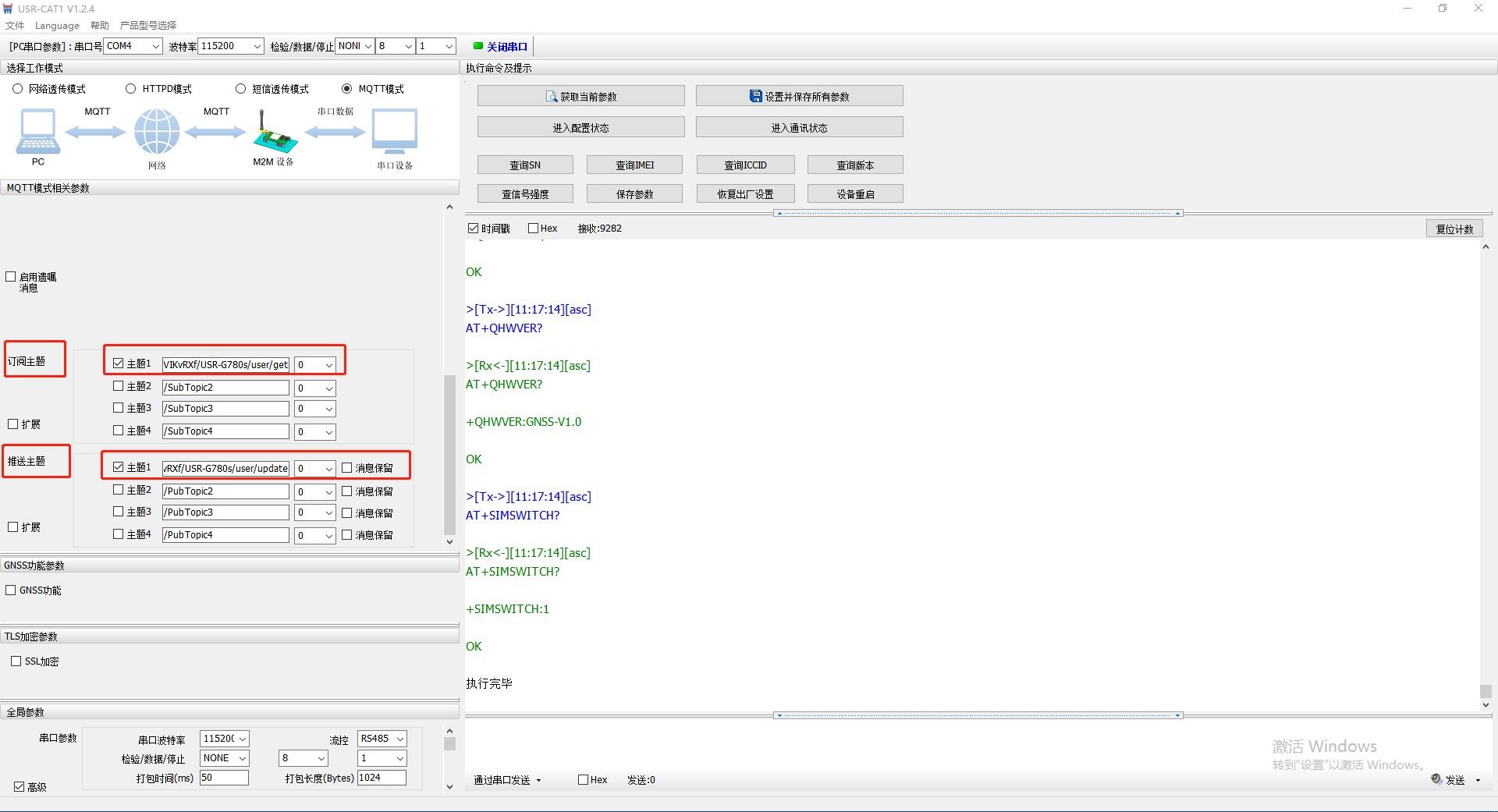 將發布的主題/i4u4VIKvRXf/USR-G780s/user/update填寫到USR-G780s推送主題配置中去;