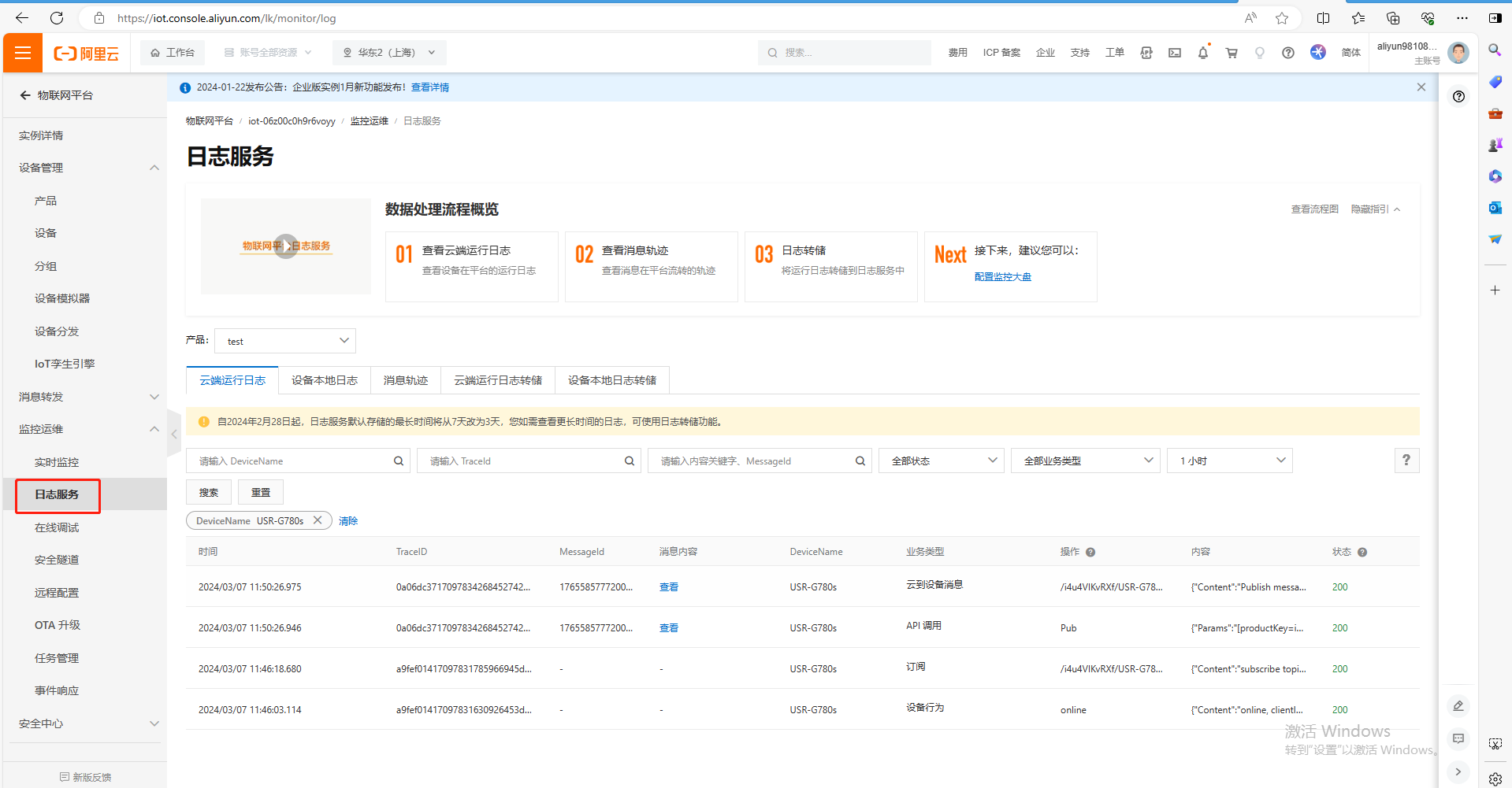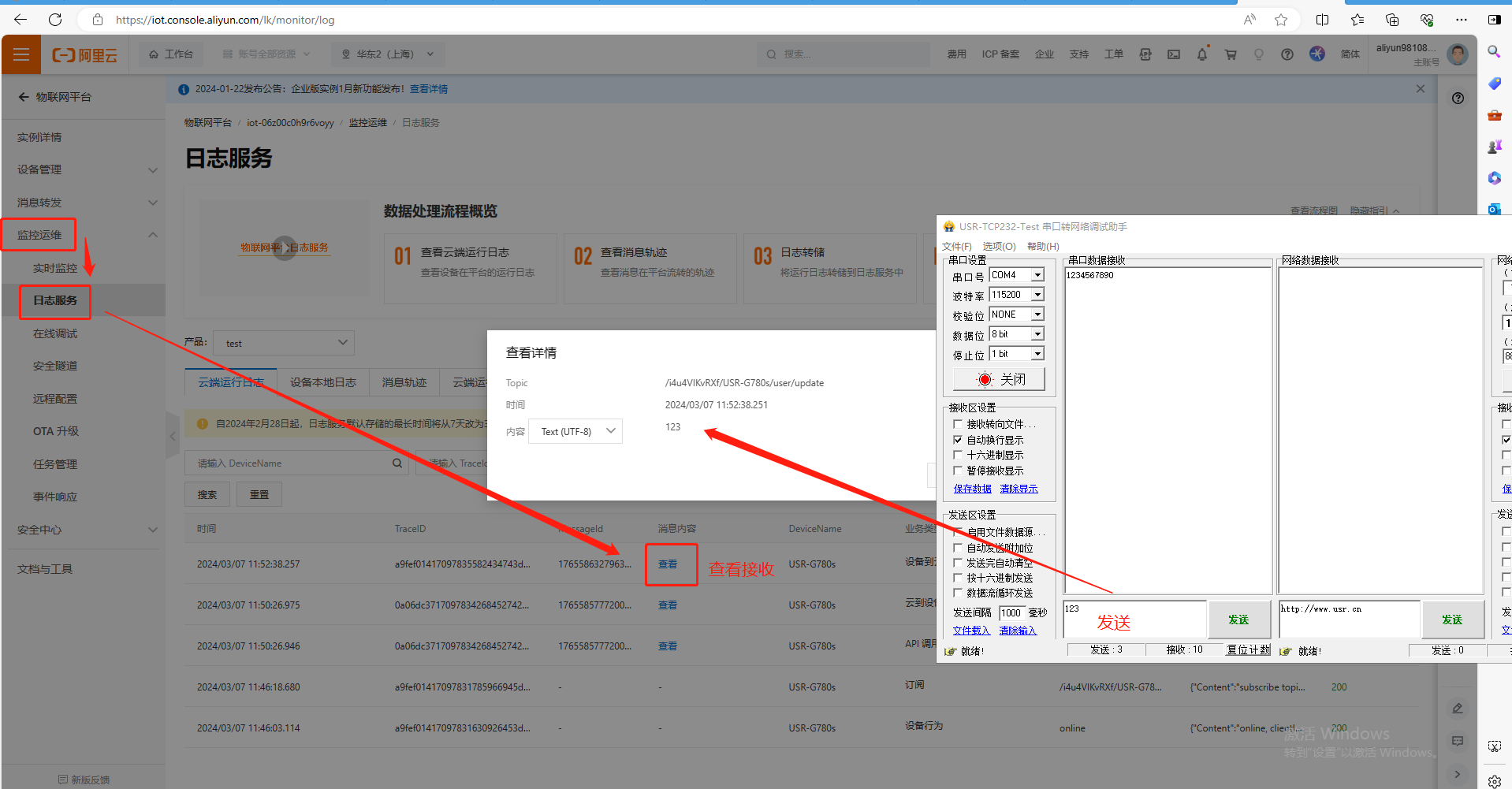 (2)USR-G780s使用串口助手發送數據123,發送完成之后,我們在阿里云平臺可以通過日志服務,點擊查看,看到USR-G780s串口發到阿里云的數據123。