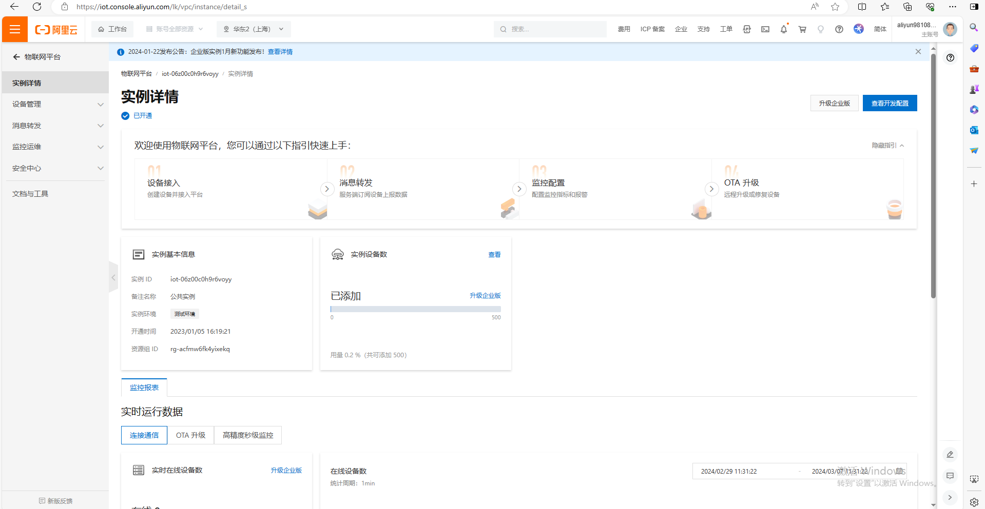 1、登陸阿里云平臺,找到物聯網平臺,這里用的連接公共實例