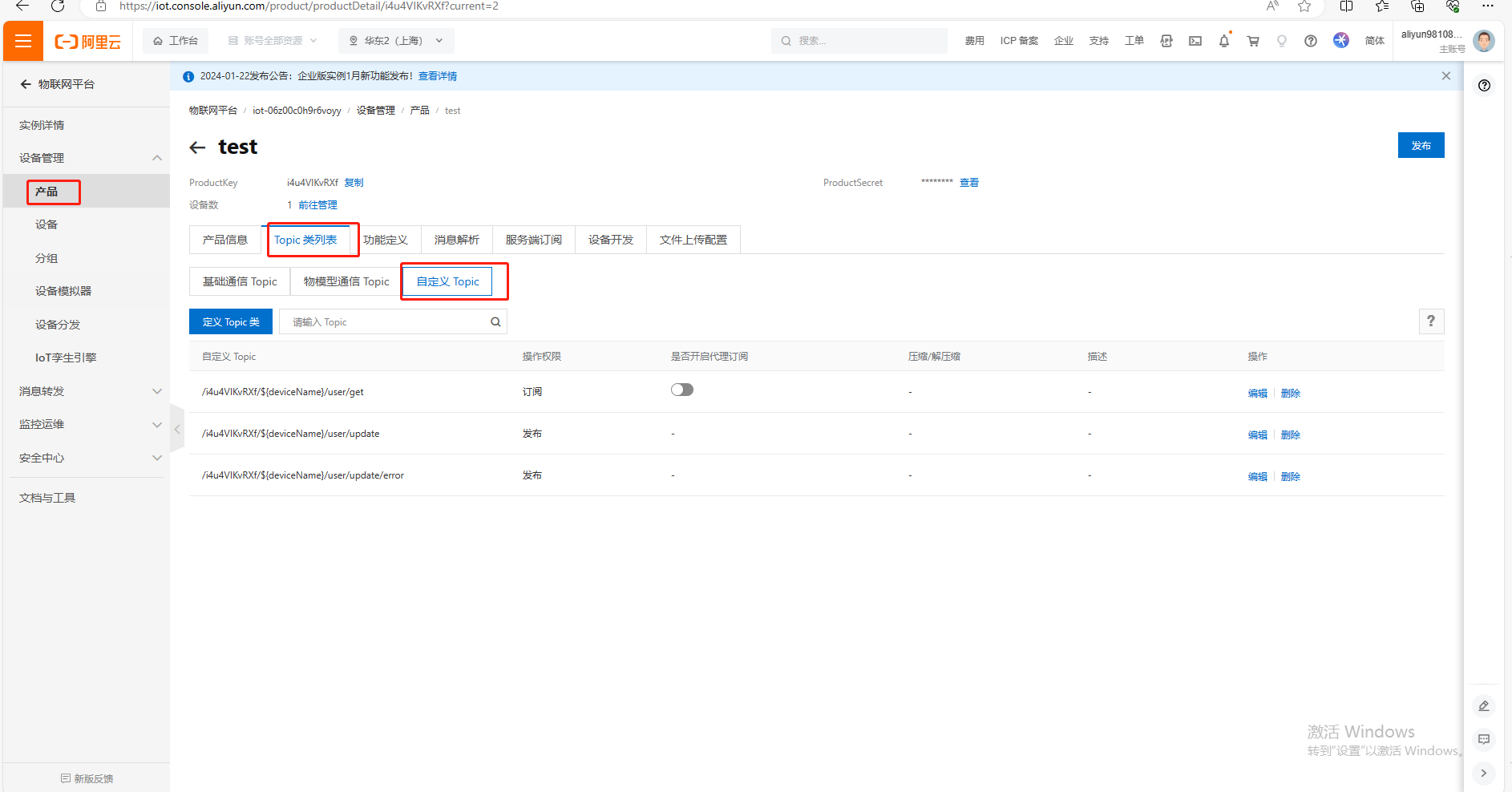 (2)點擊Topic類列表,點擊自定義Topic,找到訂閱和發布