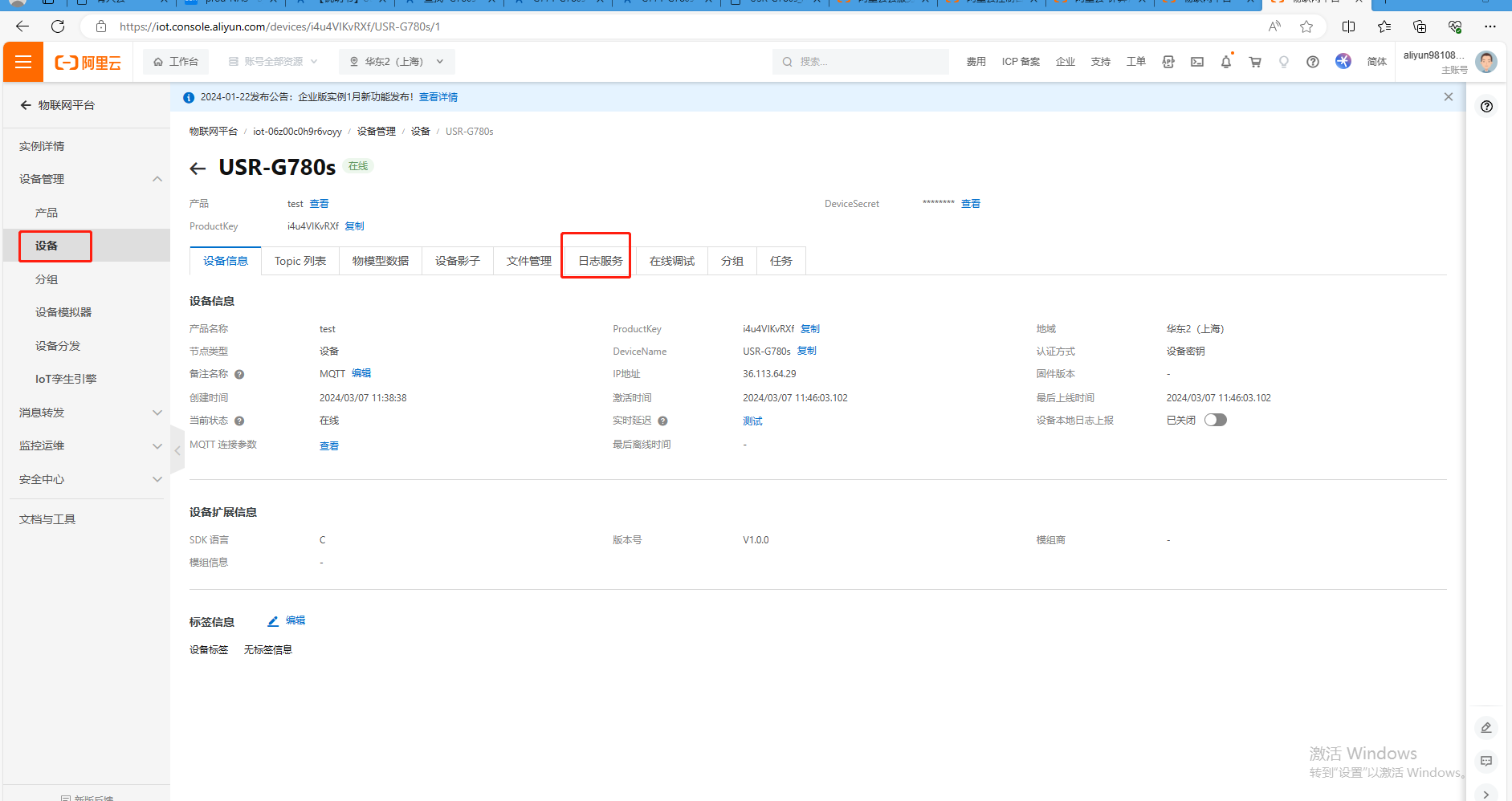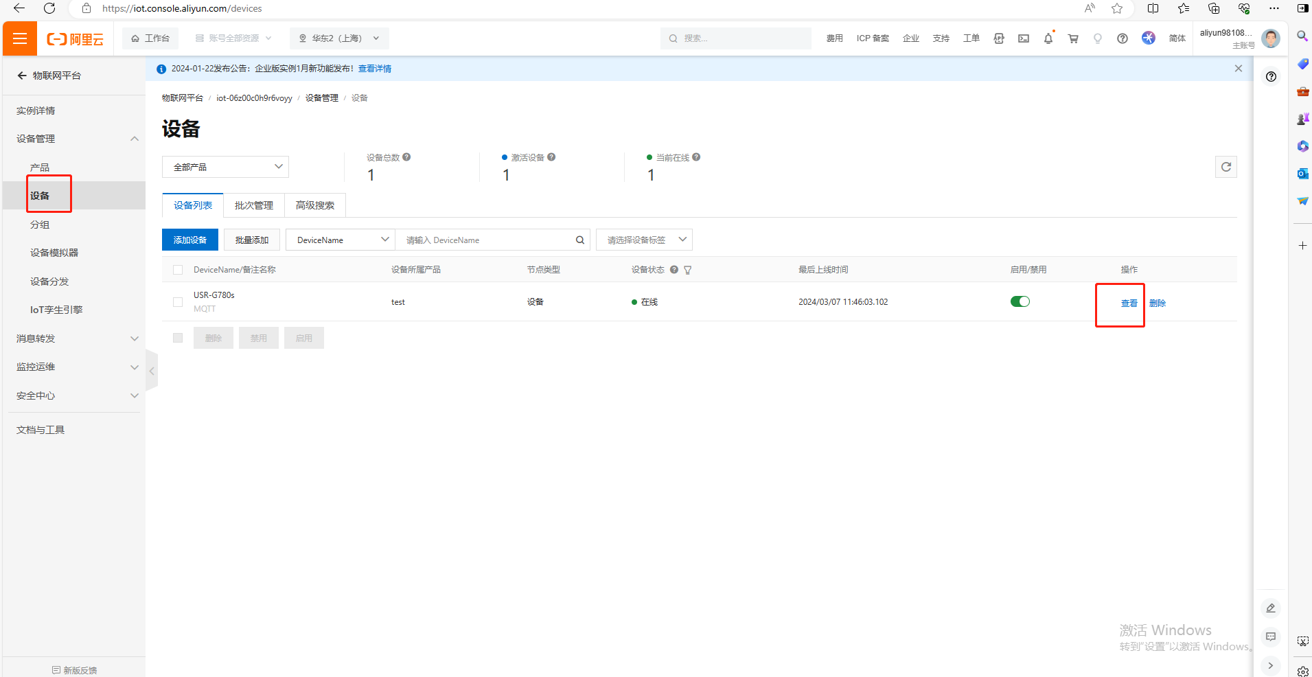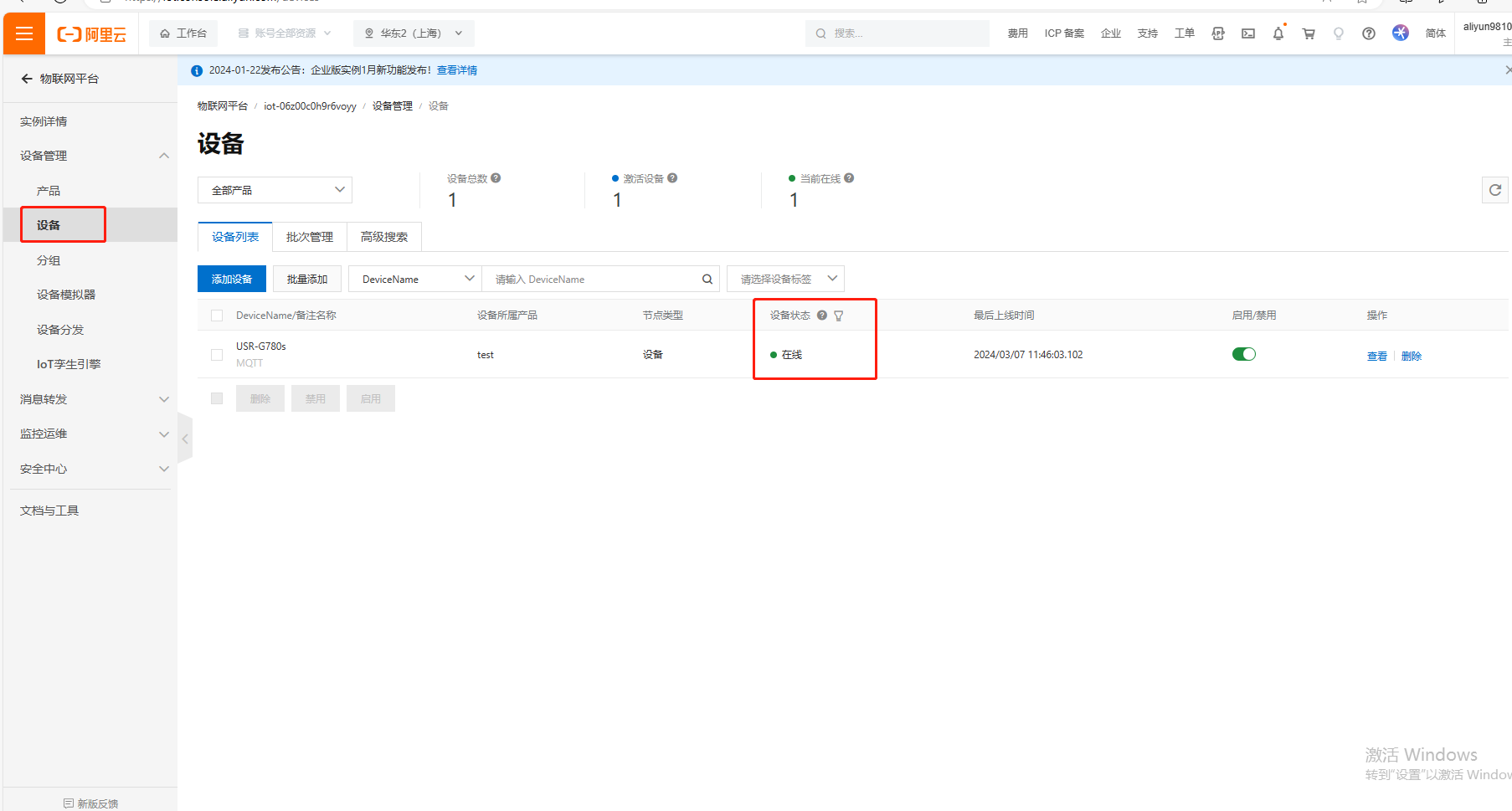 USR-G780s 設置完MQTT連接阿里云參數,聯網正常,在阿里云平臺可以看到設備狀態是在線。