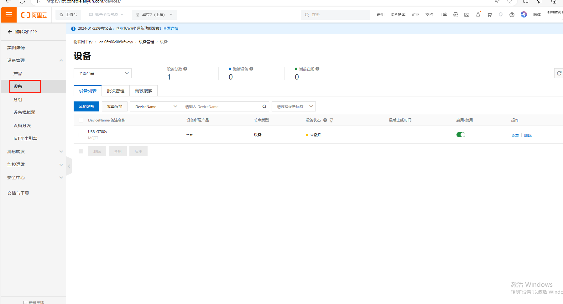 (2)添加完設備,如下圖展示,設備狀態是未激活,等設置完USR-G780s的MQTT連接阿里云參數之后,設備狀態才顯示在線。