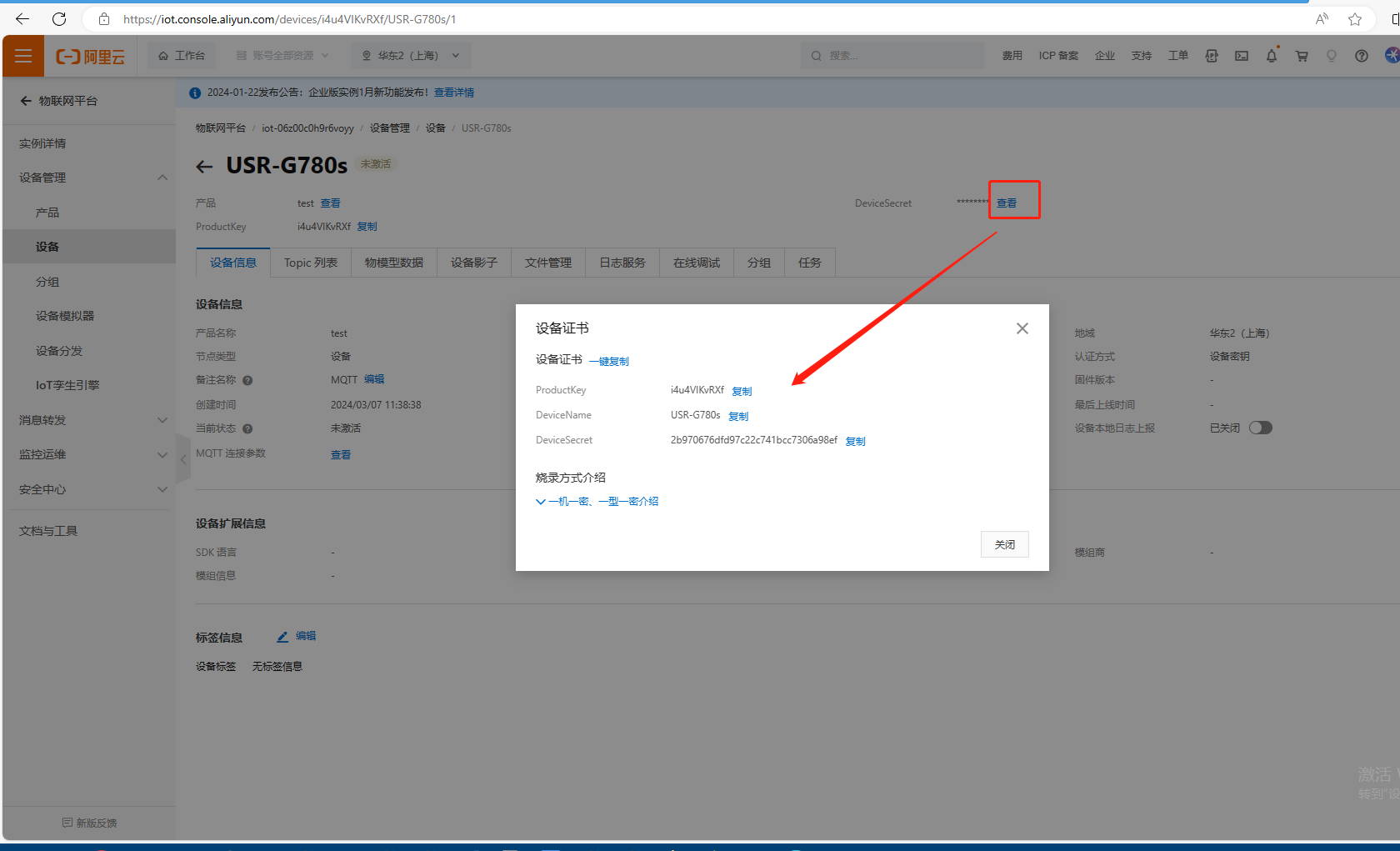 點擊設備,點擊查看,再點擊DeviceSecret后面的查看。