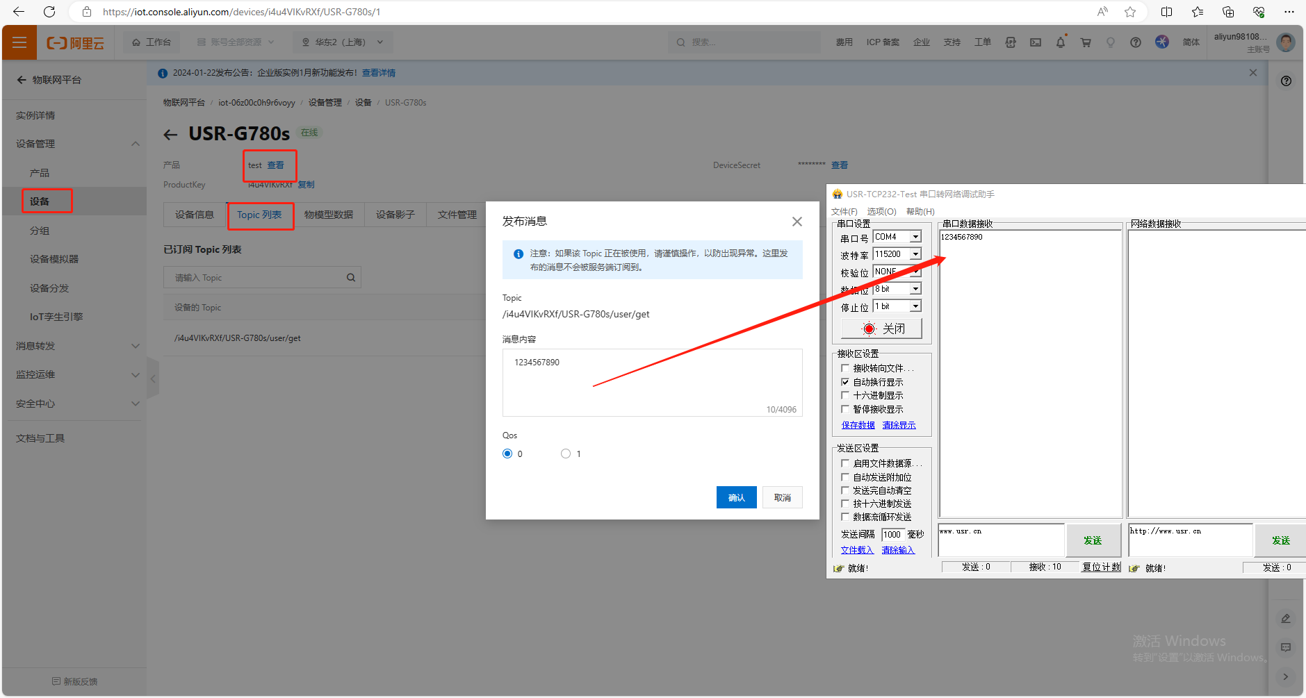 (3)使用阿里云平臺發布的消息1234567890,被USR-G780s訂閱到,并通過USR-G780s串口發給串口端,串口助手接收到阿里云下發的數據1234567890。