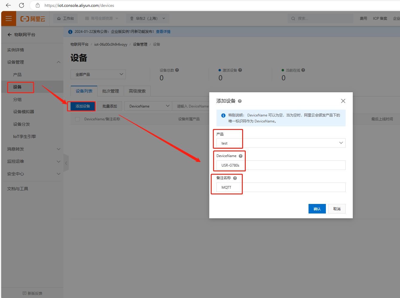 (1)產品創建成功后,添加設備。點擊設備,點擊添加設備,產品名舉例填test,DeviceName填USR-G780s,備注名稱填MQTT,點擊確認。