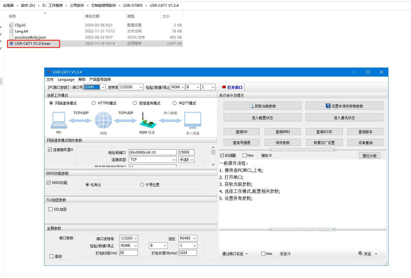 USR-G780s 的232串口接USB-RS232串口線到電腦USB口,接好4G天線,然后產品接12V電源適配器上電。