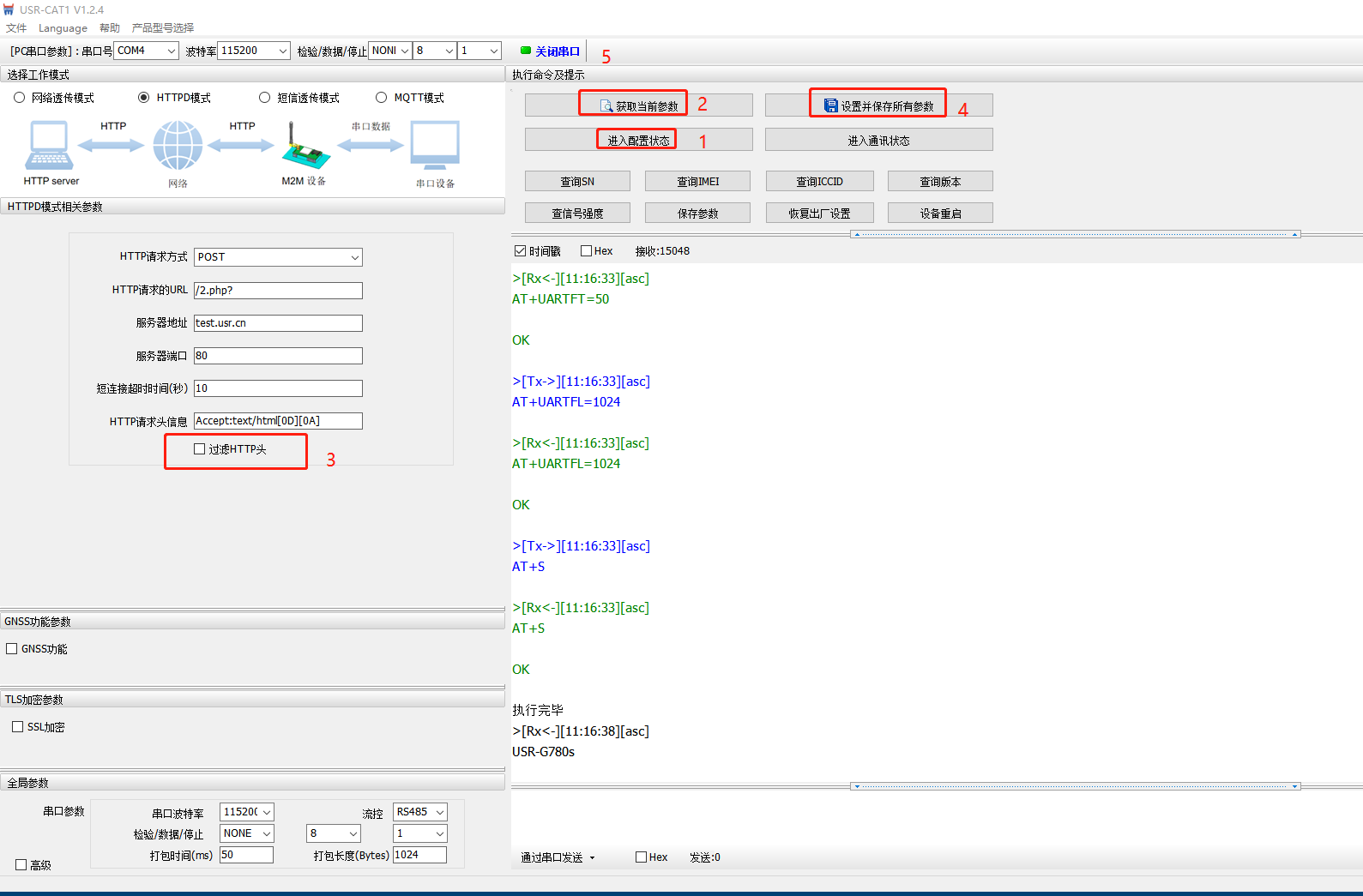 (1)關(guān)閉串口助手,打開USR-G780s的設(shè)置軟件,打開串口,點擊進入配置狀態(tài),點擊獲取當(dāng)前參數(shù),取消勾選過濾HTTP頭功能,點擊設(shè)置并保存所有參數(shù)。參數(shù)設(shè)置成功之后,設(shè)置軟件關(guān)閉串口。
