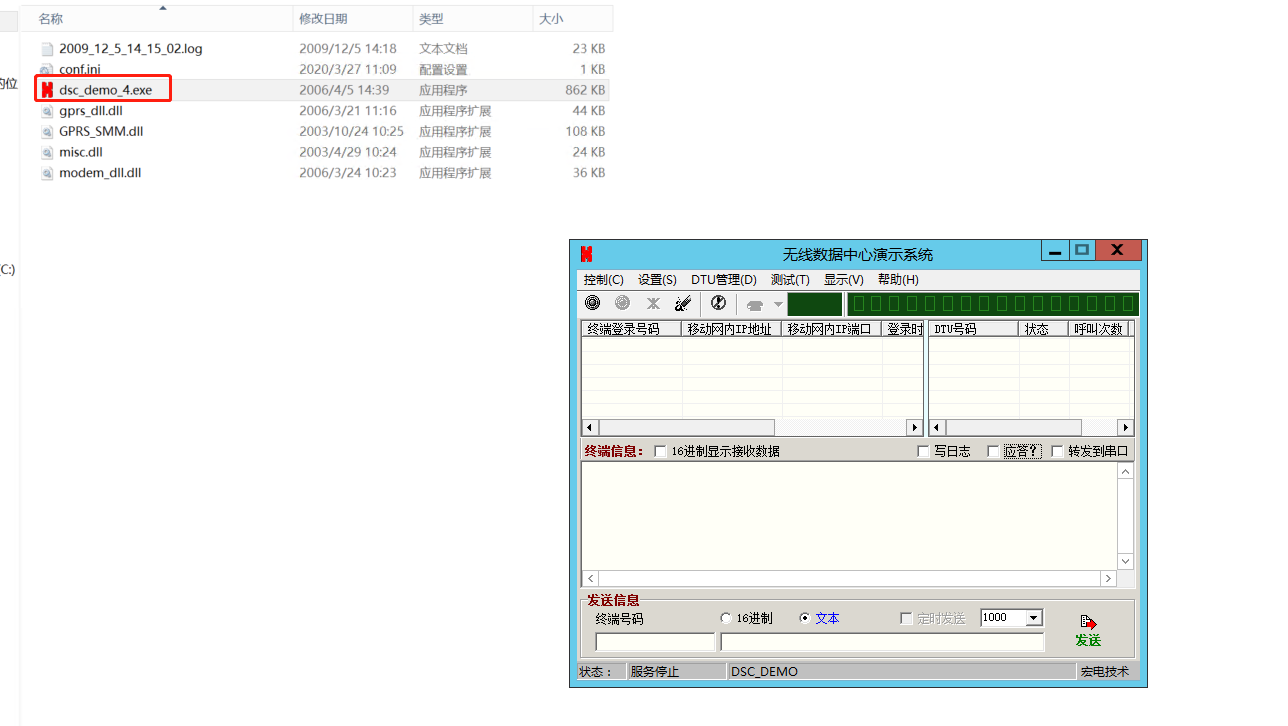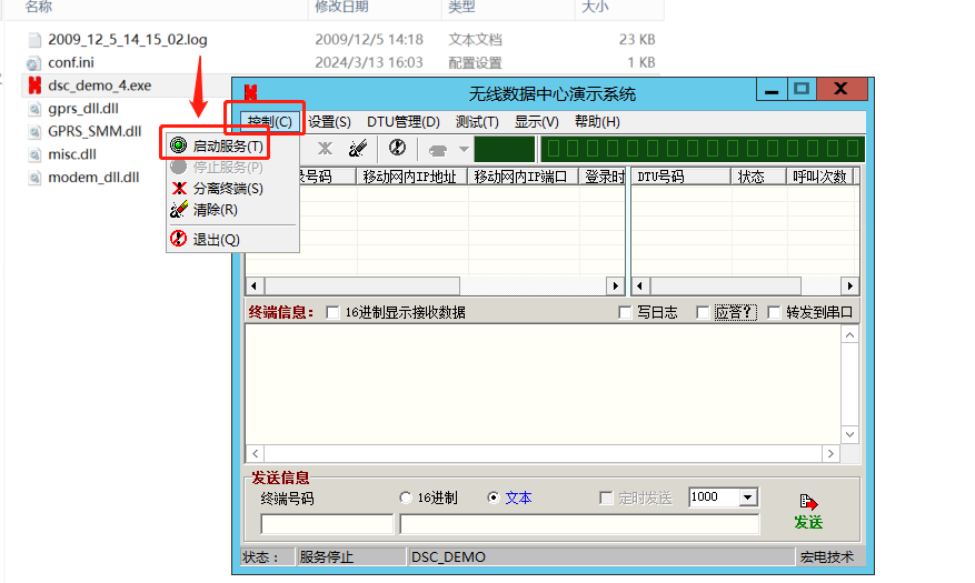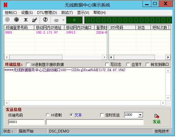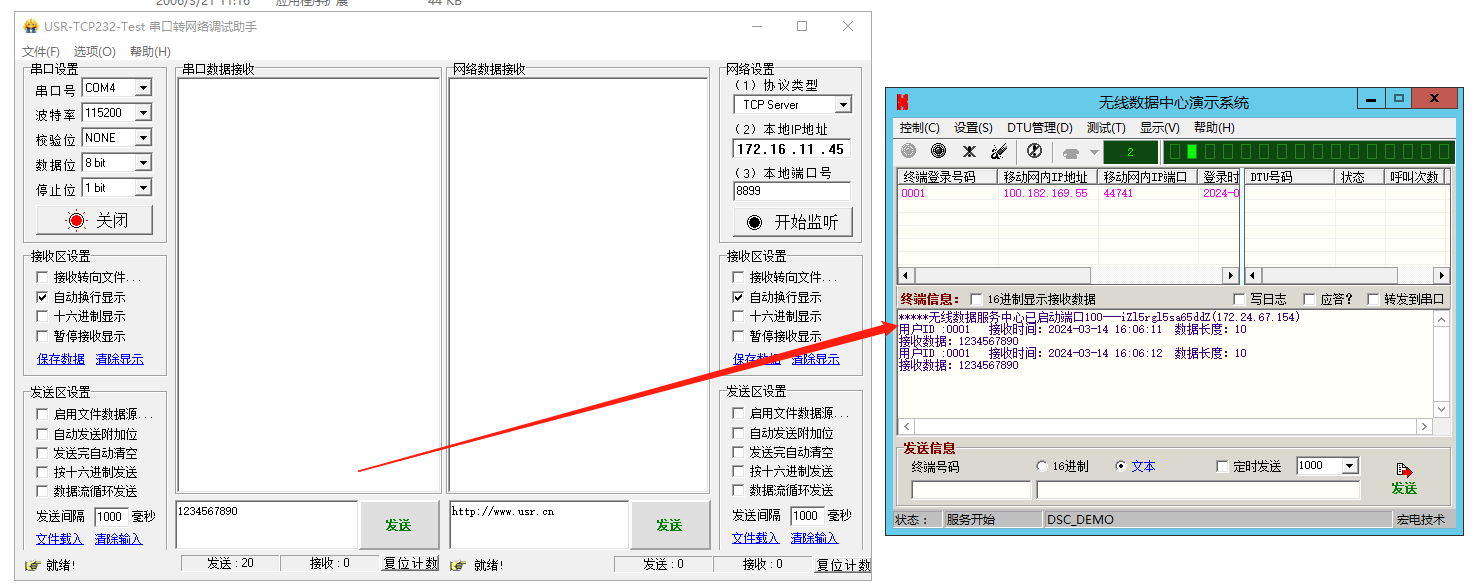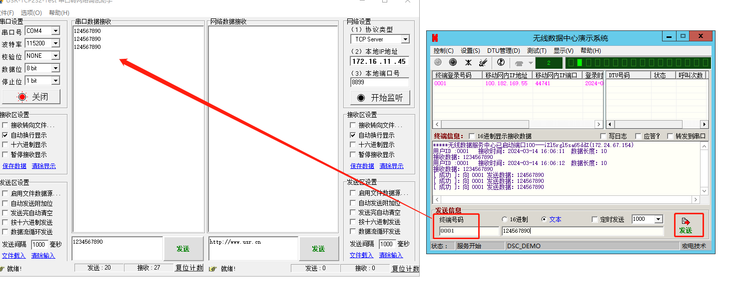 6、無線數據中心演示系統發送信息區,對終端號碼0001,發送1234567890,USR-G780 V2連接的串口助手,接收到數據1234567890。