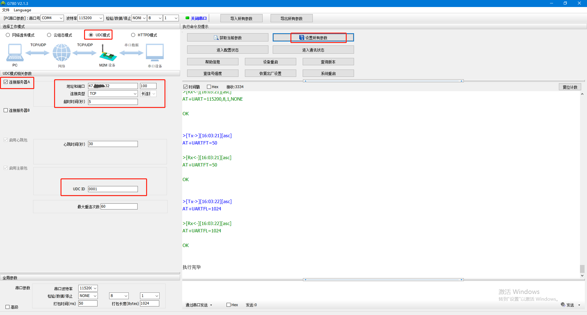 4、選擇UDC模式,勾選連接服務器A,地址設置要連接的遠程服務器地址,端口100,連接類型TCP,長連接。UDC ID用0001。設置完參數,點擊設置所有參數,點擊設備重啟。