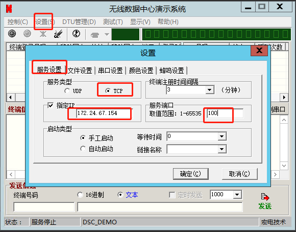 2、點擊設置,點擊服務設置,服務類型勾選TCP,勾選指定IP,輸入遠程服務器對應的服務器IP,服務端口用100,點擊確定。