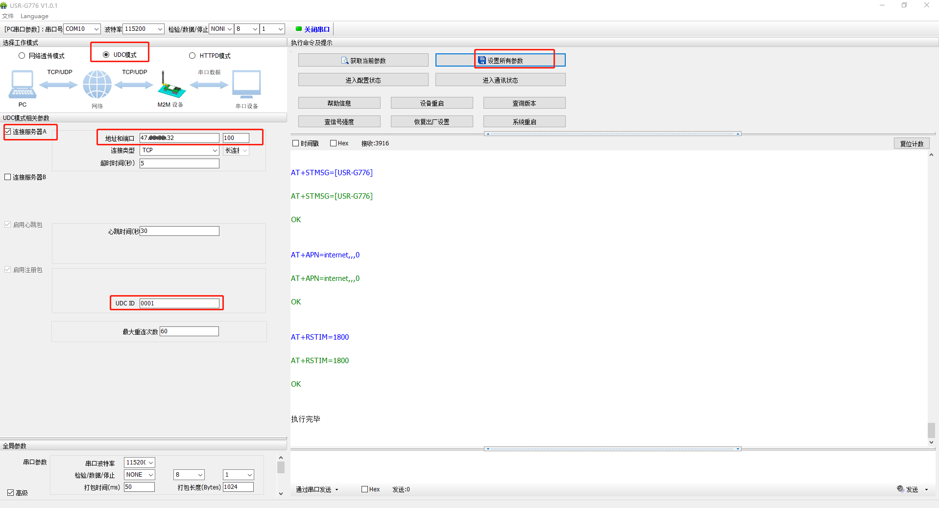 4、選擇UDC模式,勾選連接服務(wù)器A,地址設(shè)置要連接的遠程服務(wù)器地址,端口100,連接類型TCP,長連接。UDC ID用0001。設(shè)置完參數(shù),點擊設(shè)置所有參數(shù),點擊設(shè)備重啟。