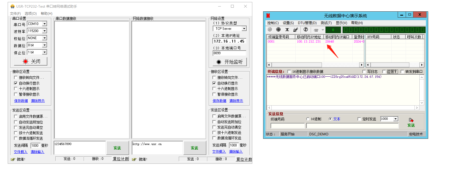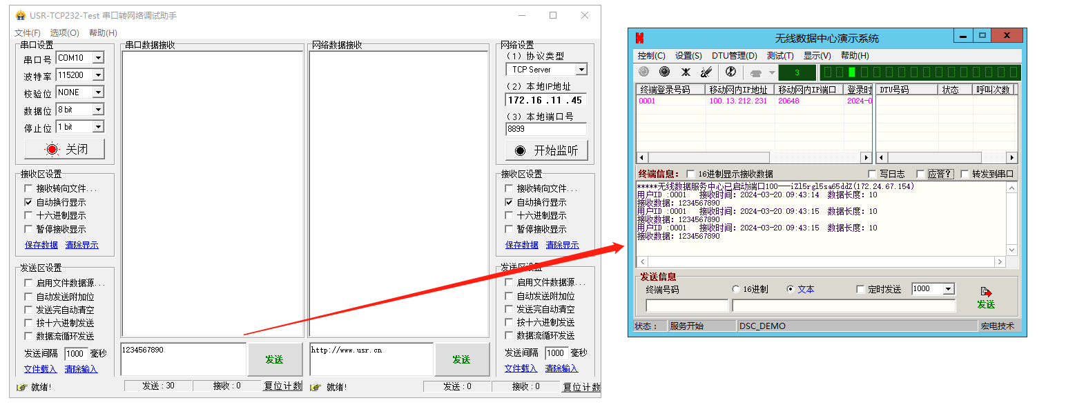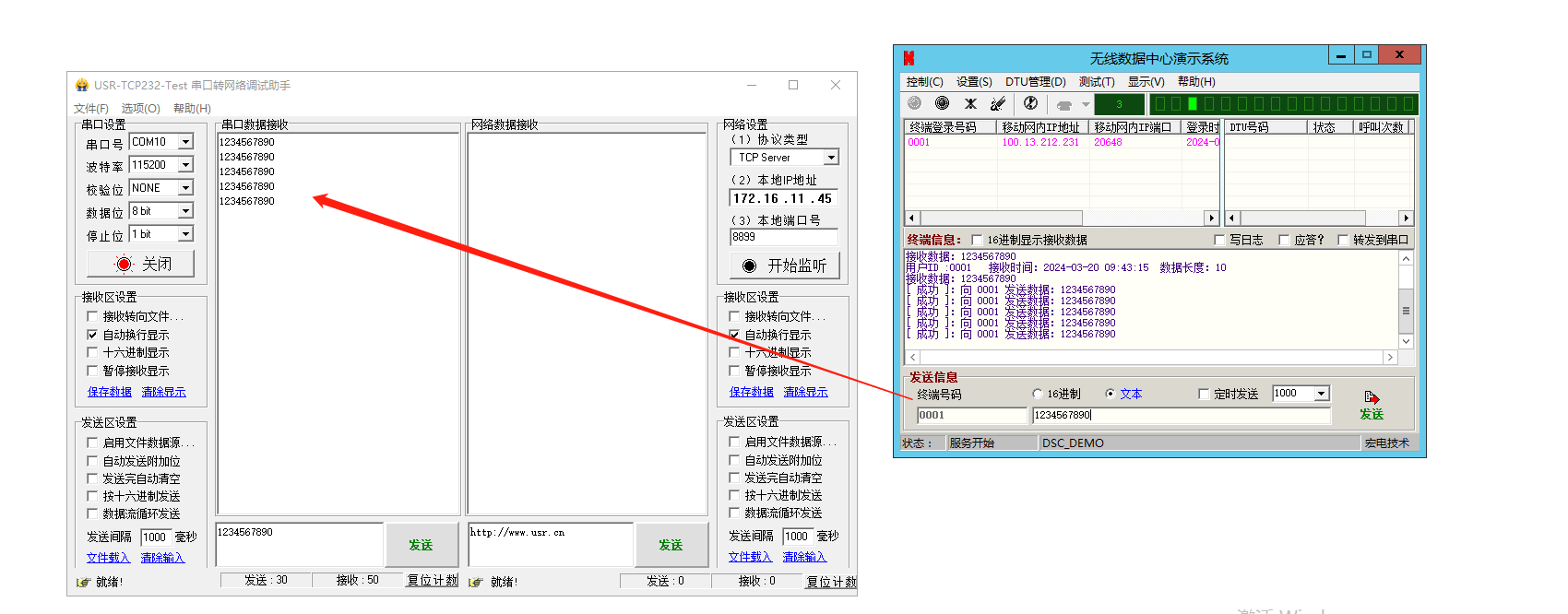 5、USR-G776接USB-RS485到電腦,電腦打開串口助手,打開COM口,發(fā)送數(shù)據(jù)1234567890,遠程服務(wù)器上的無線數(shù)據(jù)中心演示系統(tǒng)顯示接收信息。