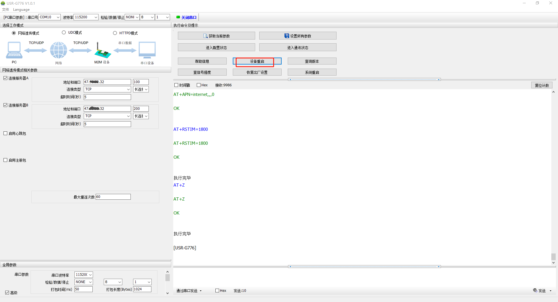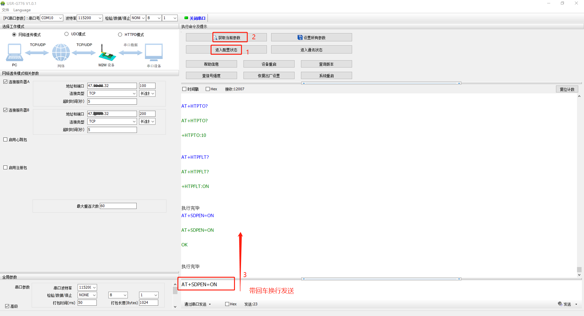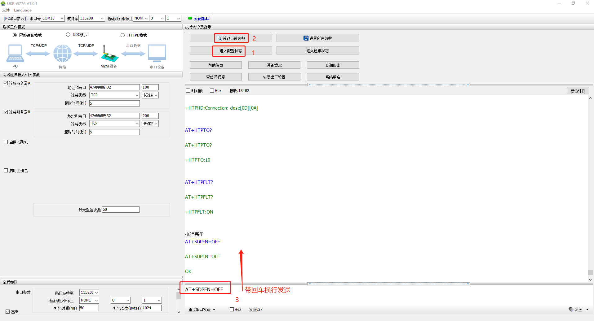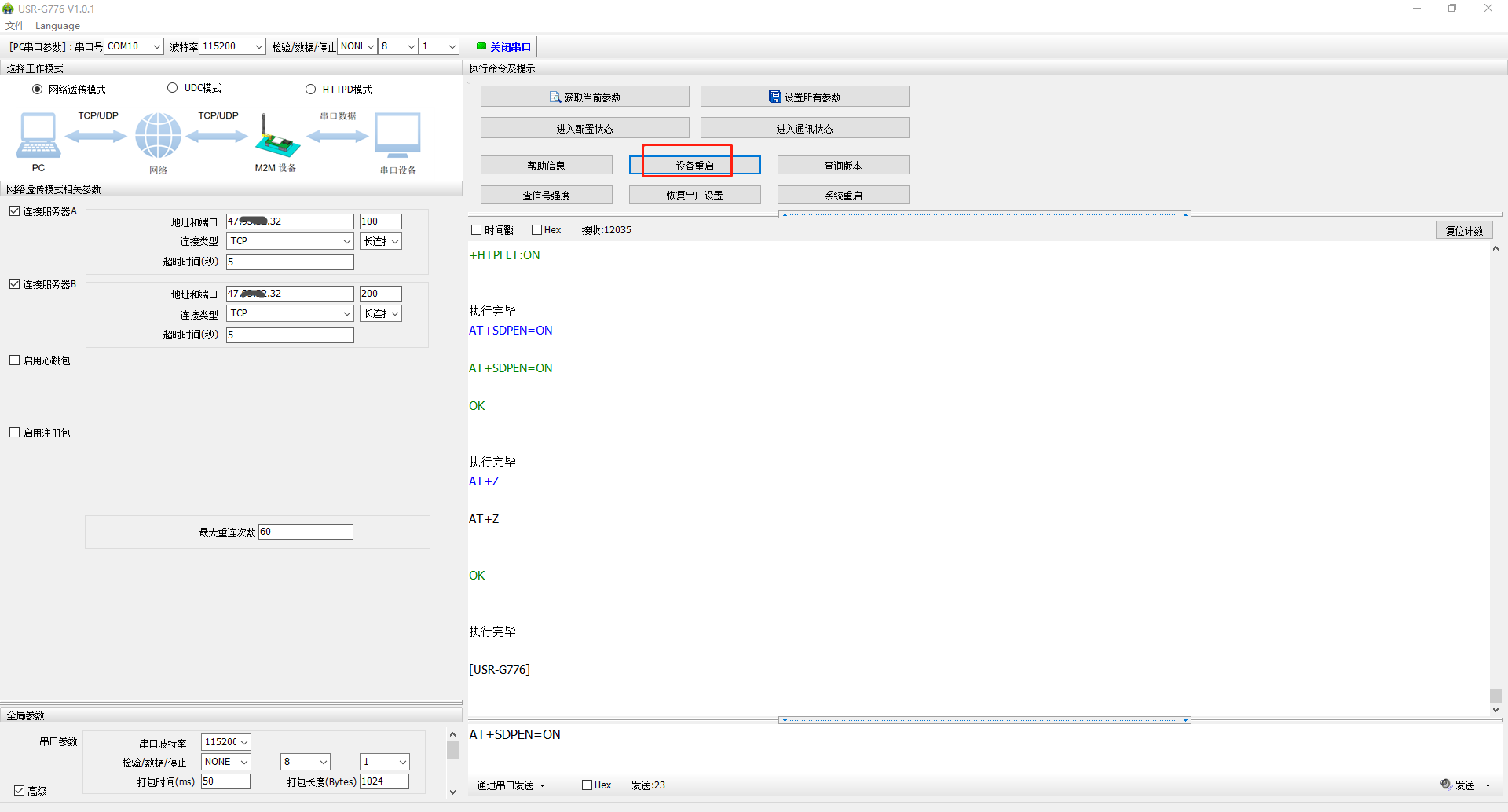 5、串口再次進入配置狀態,用AT指令AT+SDPEN=ON開啟套接字分發功能,點擊設備重啟。