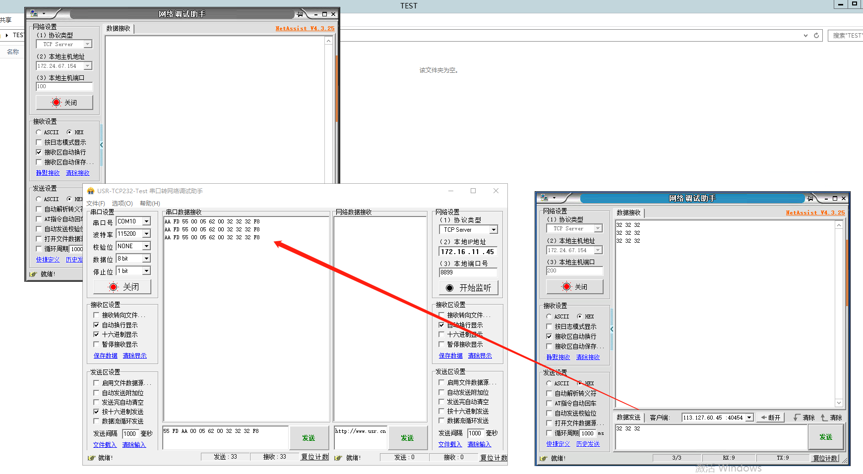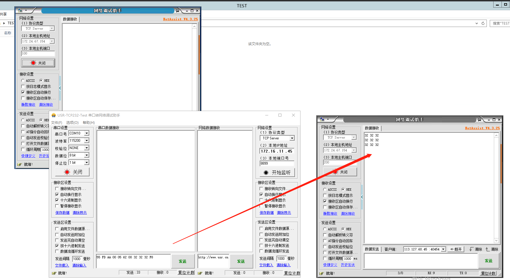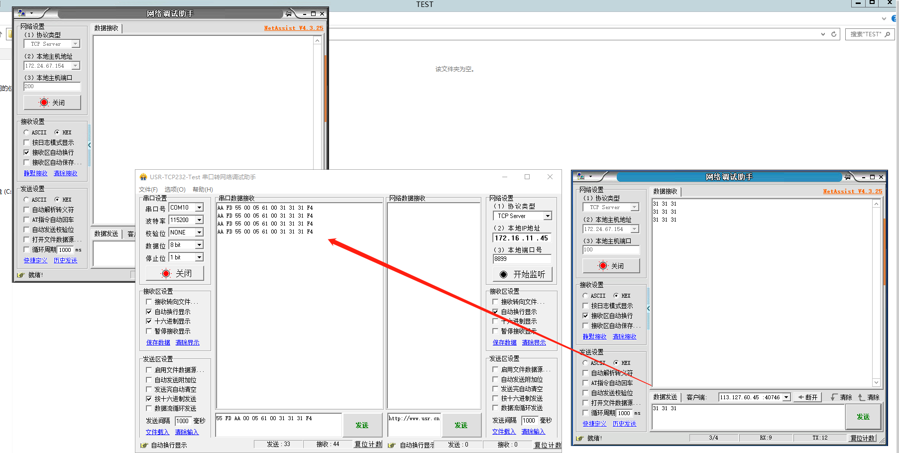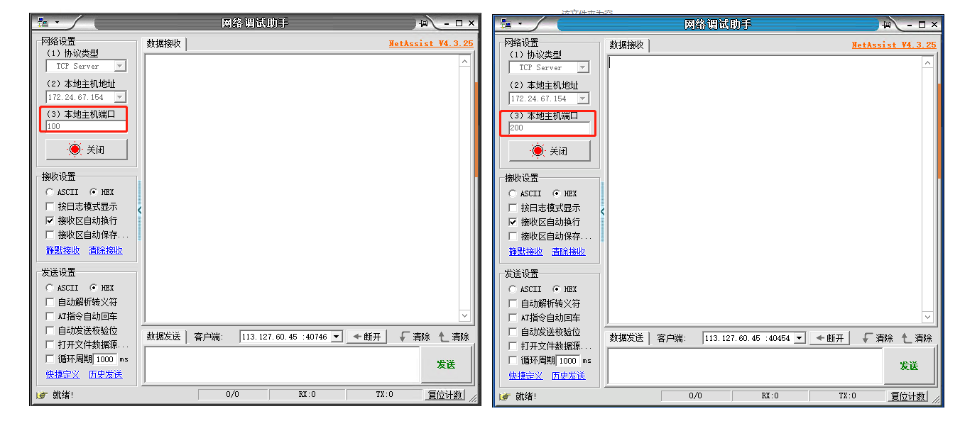 1、登錄遠程服務器,打開2個網絡助手,分別使用2個端口100、200,點擊連接。USR-G776會和2個網絡助手建立TCP連接。