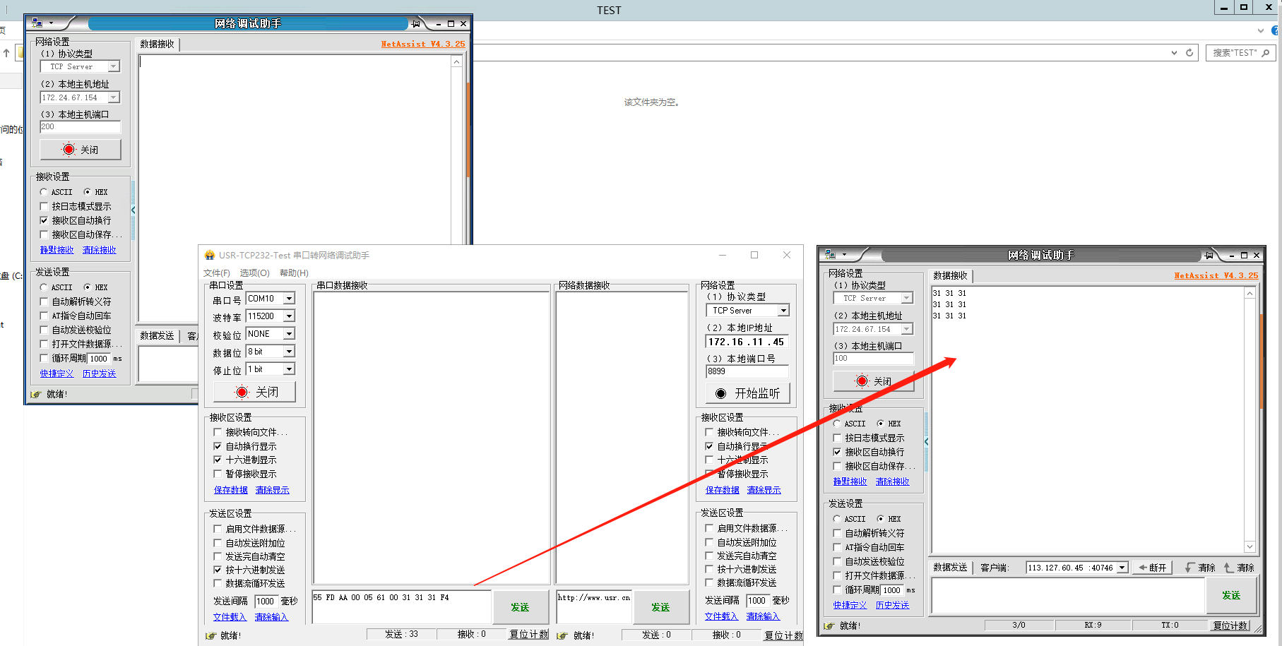 按照規則計算,得出向服務器B(參數區用62 00)發送數據32 32 32是HEX格式的:55 FD AA 00 05 62 00 32 32 32 F8