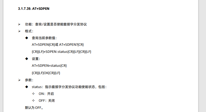 1、設置軟件串口進入配置狀態,獲取當前參數,用AT指令AT+SDPEN=OFF關閉套接字分發功能。